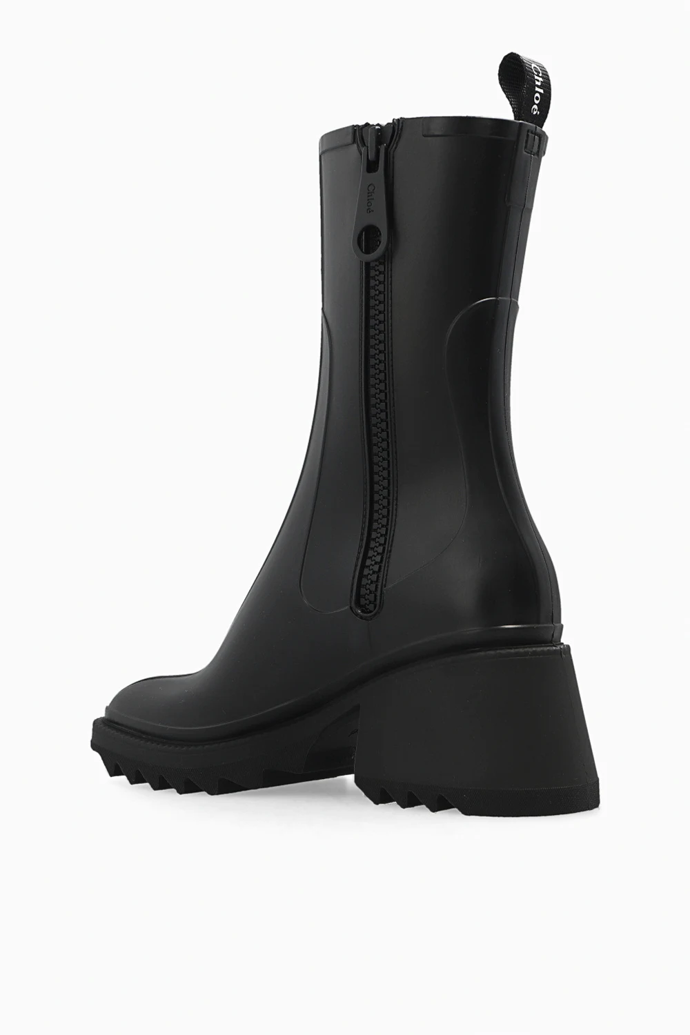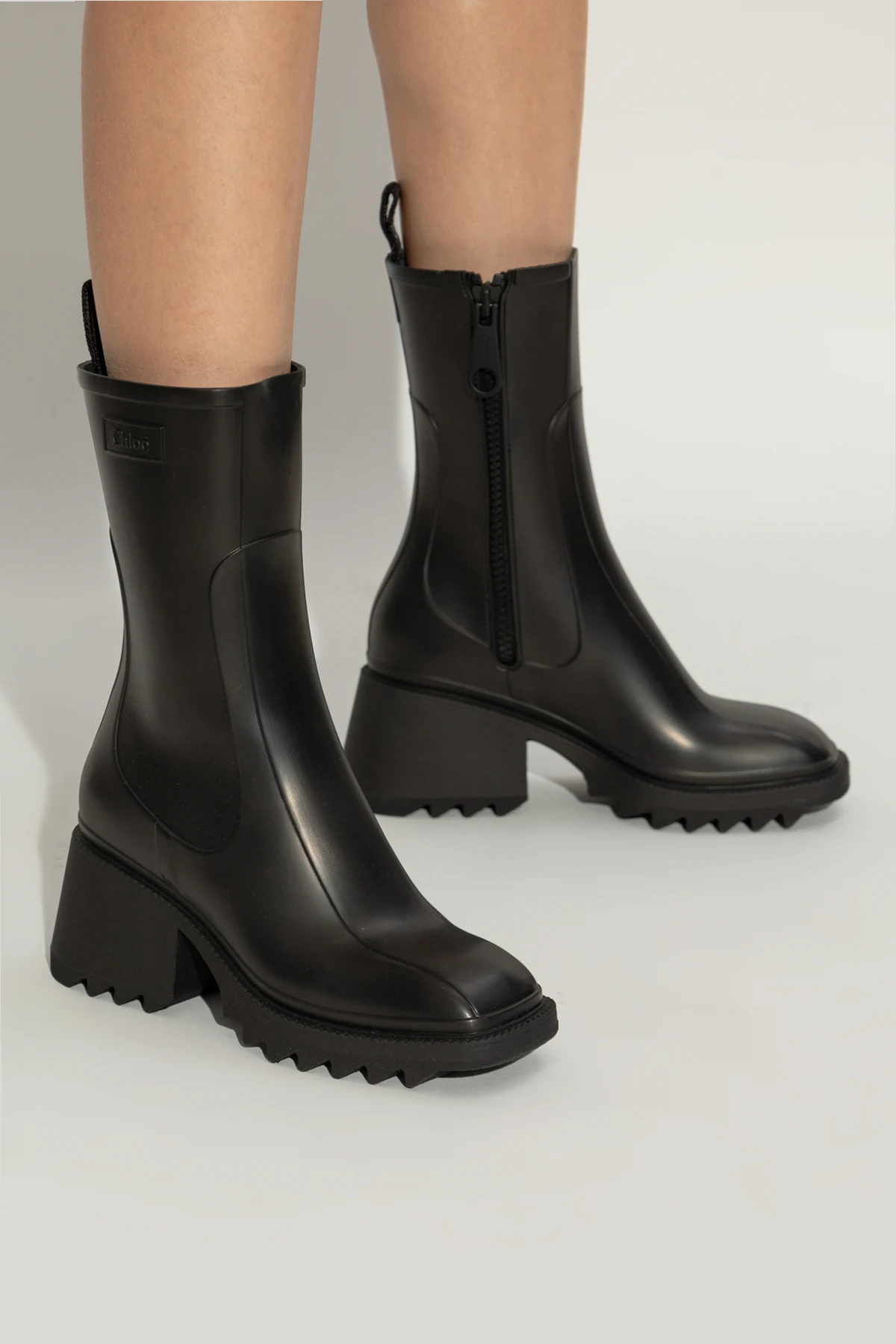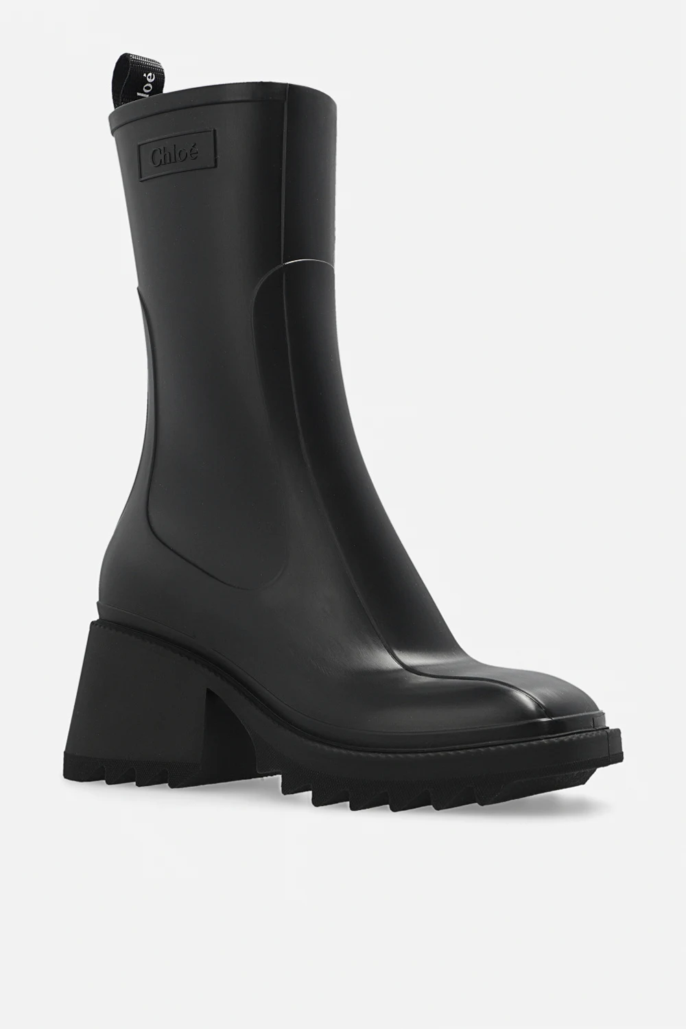 Black 'Betty’ heeled ankle boots from Chloe. Crafted from rubber, this model showcases the brand's logo and a side zip fastening.