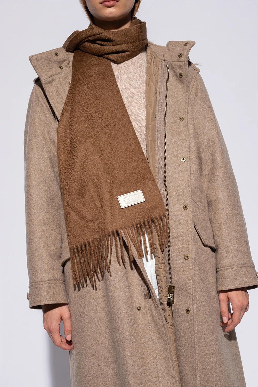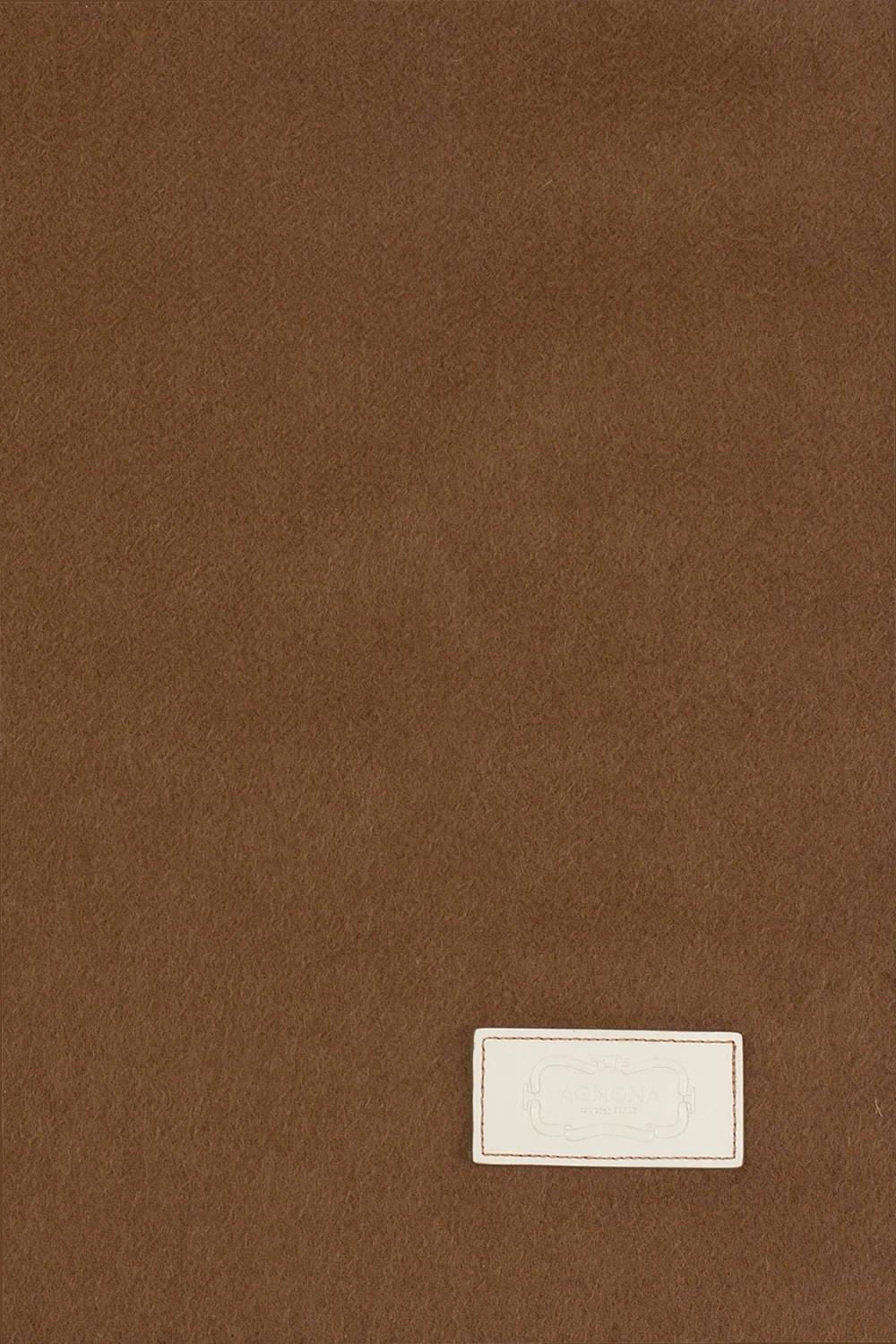 Brown scarf from Agnona. Crafted from cashmere, this design is enriched by fringes and a logo-embossed cream patch.