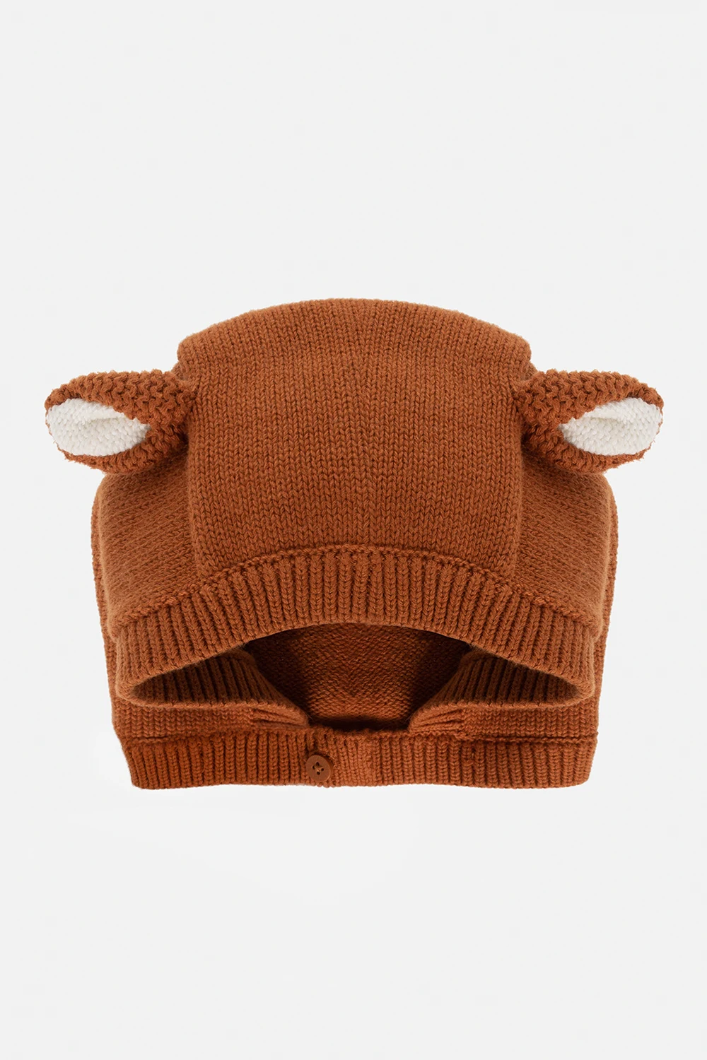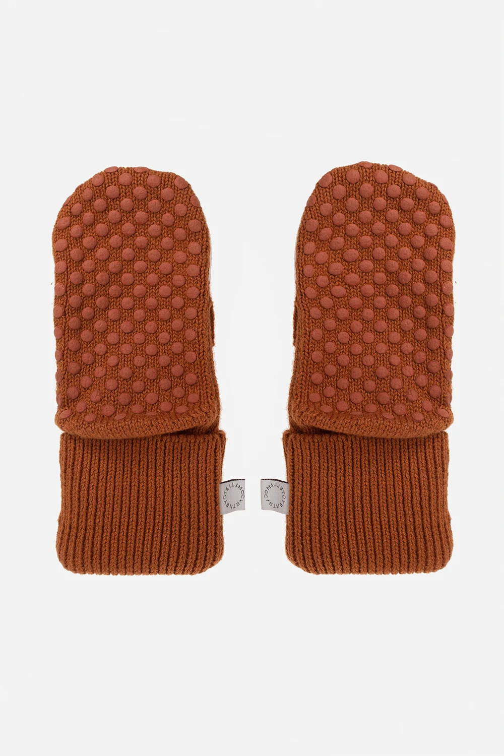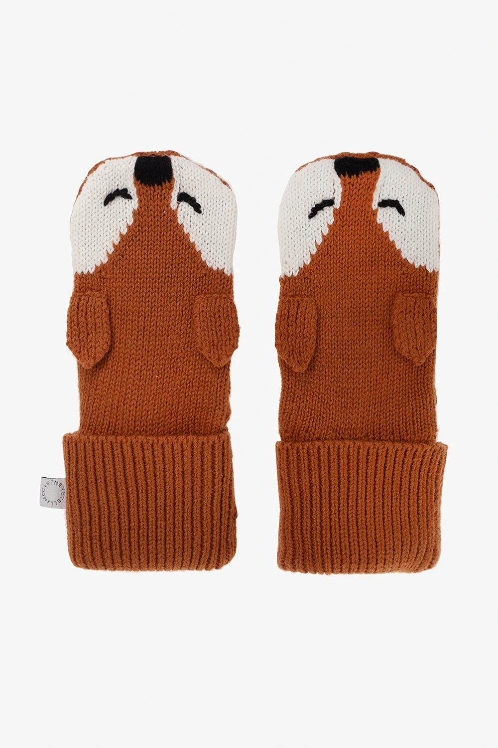 Brow and white beanie & mittens kit from Stella McCartney Kids. Crafted from a blend of organic cotton and wool. The beanie has sewn ears, a single button closure and a turn-up hem. The mittens have white and black animal embroidery, elasticized trims and non-slip details.