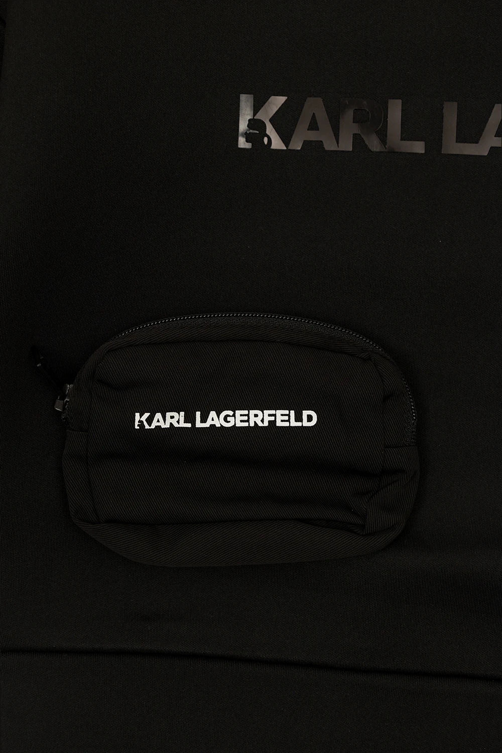 Black crewneck sweatshirt from Karl Lagerfeld Kids. Embellished with a graphic print with the designer's logo, this style features a distinctive zip pocket, long sleeves and ribbed trims on the edges.