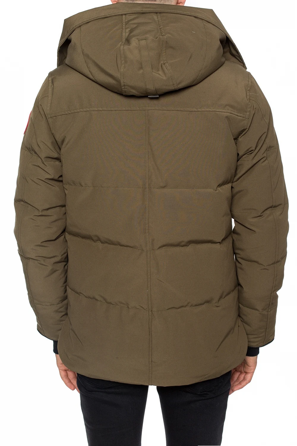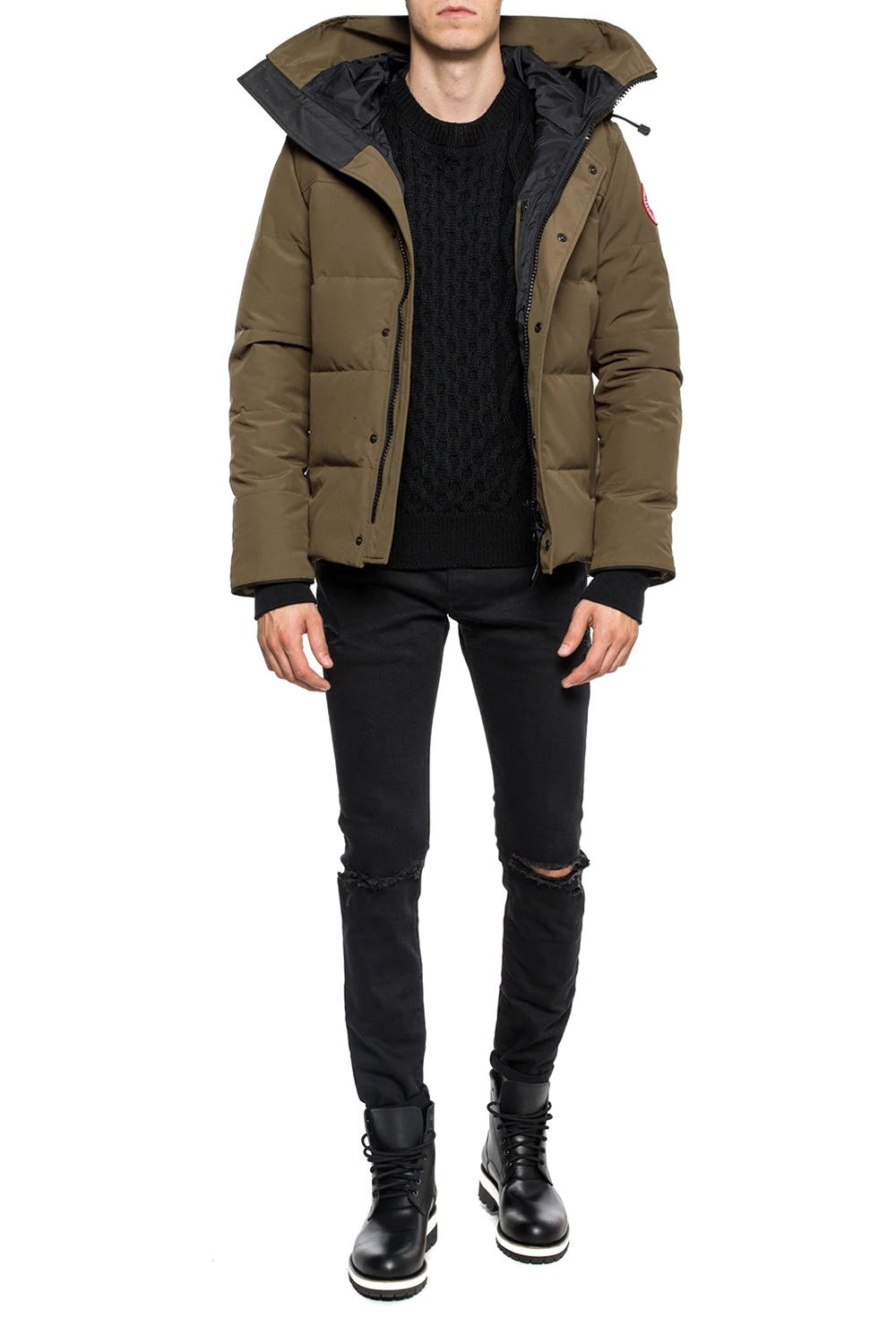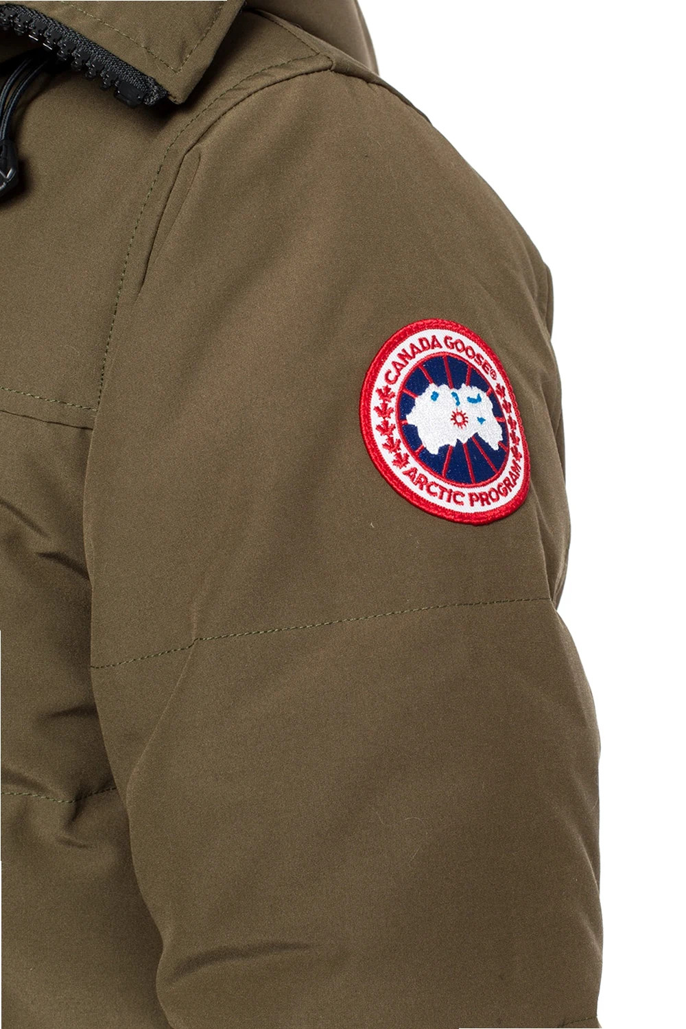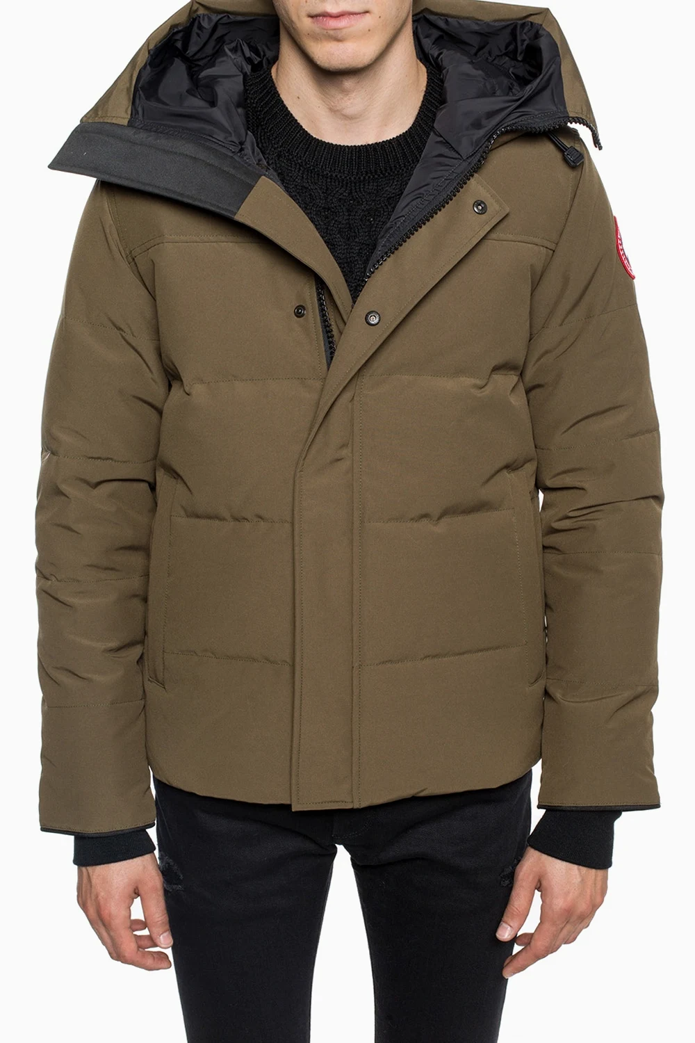 Olive green 'Macmillan' hooded quilted down jacket from Canada Goose. Fastened with two-way zip and snaps. Enriched by multicoloured patch with embroidered logo on the sleeve. Features 2 zip pockets at front, drawstrings on hood and elasticated cuffs. Temperature range -10°C to -20°C.