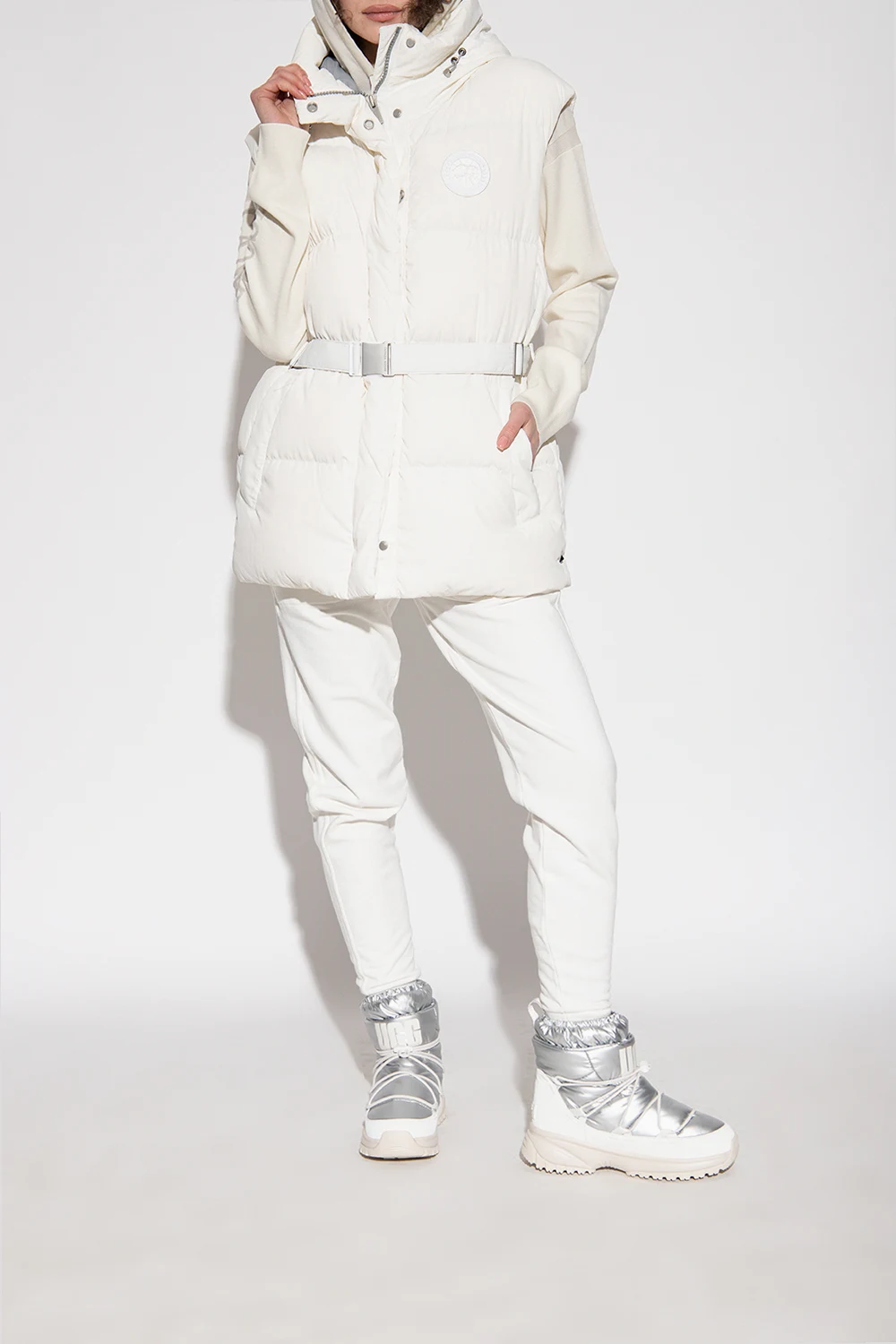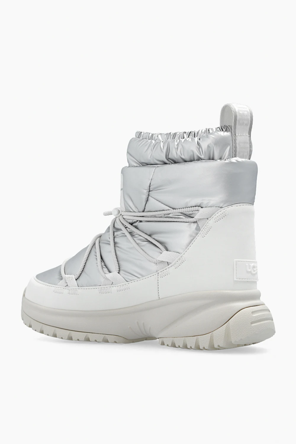 Silver-tone and cream ‘Yose Puff’ snow boots from UGG. Made of waterproof materials, this slip-on pair features drawstrings, logo print, UGGplush™ insole, Treadlite midsole, 200g insulation, DryTech technology and light beige rubber sole. Protects against weather conditions for temperatures as low as -32°C.