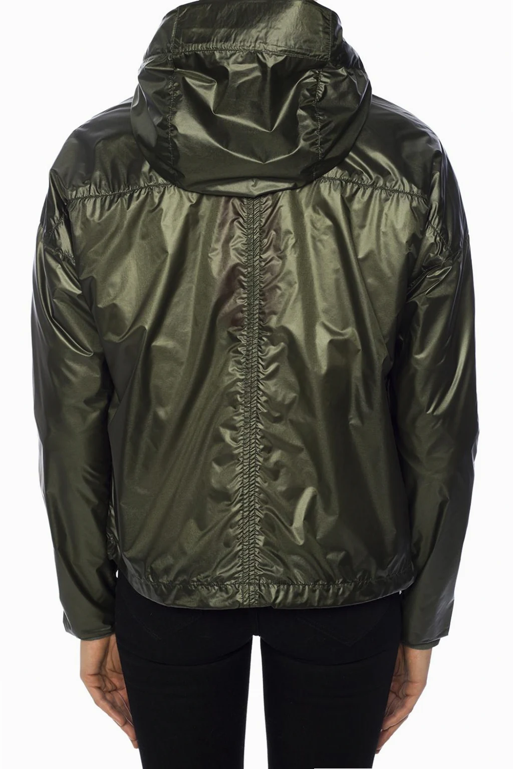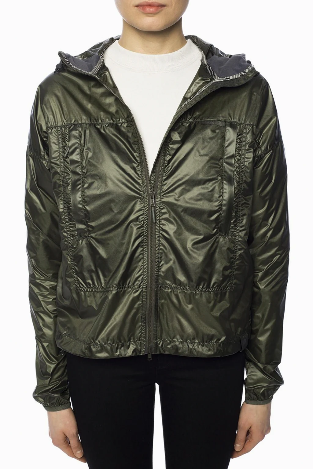 Dark green 'Sandpoint' hooded rain jacket from Canada Goose. Two-way zip fastening. Drawstring hem. 2 zip pockets at front. Patch with grey logo at the bottom. Long sleeves. Elasticated cuffs. Temperature range 5°C to -5°C.