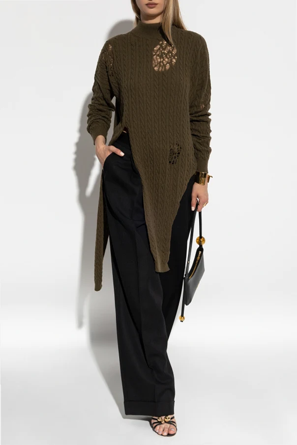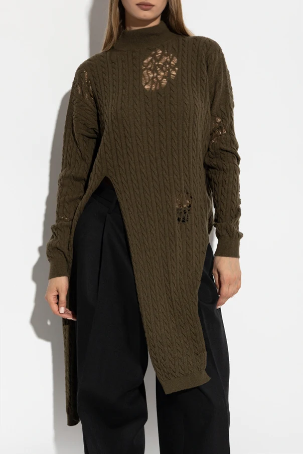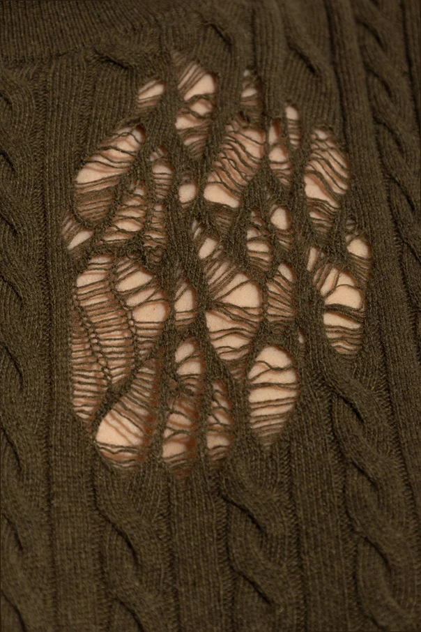 Strickpullover mit Used-Effekt von Blumarine ist eine Empfehlung für Liebhaberinnen raffinierter Avantgarde und mutiger Neuinterpretationen von Klassikern. Er besticht durch seine tiefe, olivgrüne Farbe und ein durchdachtes Spiel der Kontraste: traditionelles Zopfmuster und bewusst unregelmäßige Abriebspuren, die dem Ganzen einen unverwechselbaren Charakter verleihen.