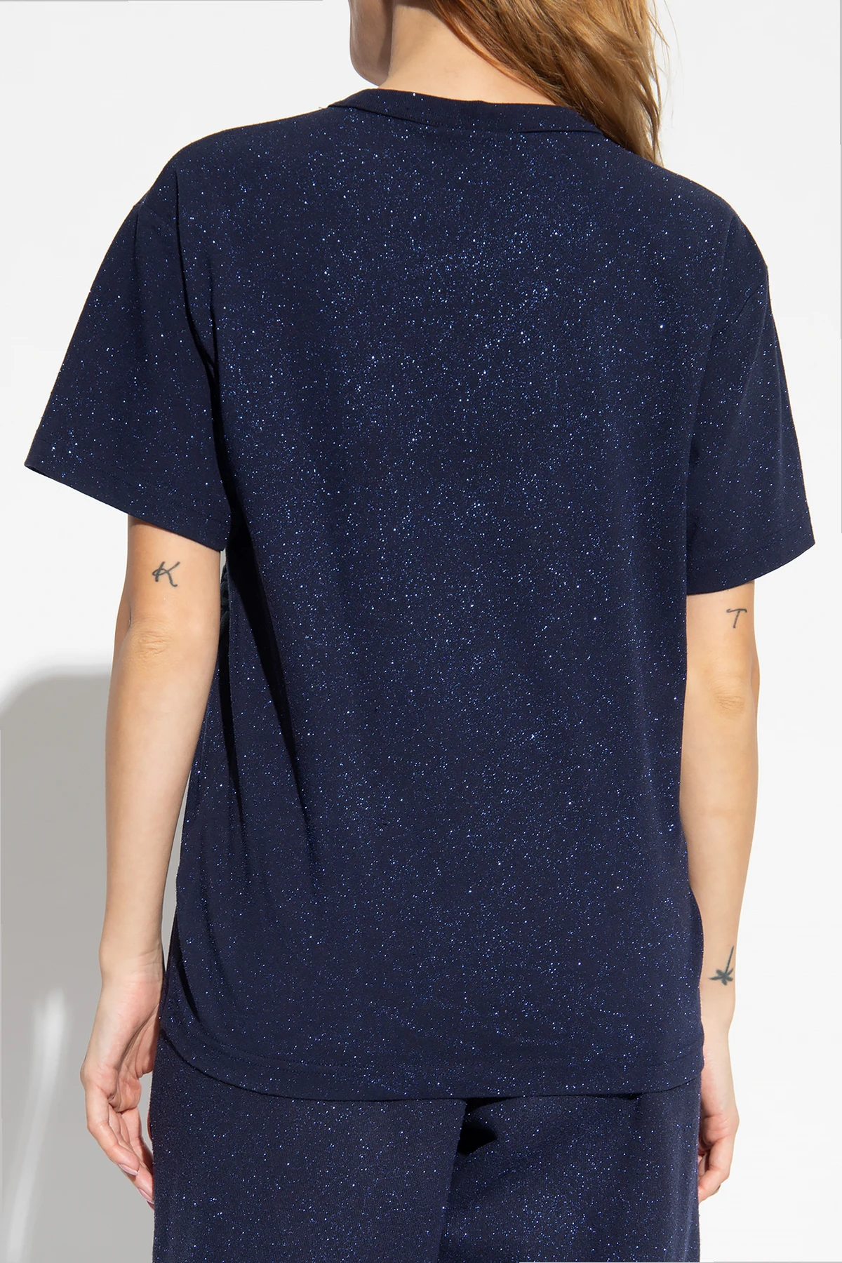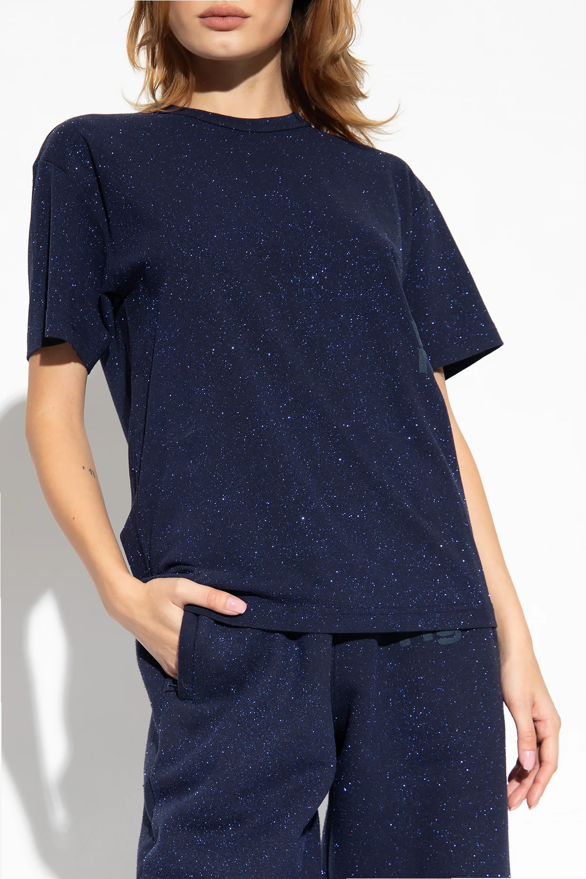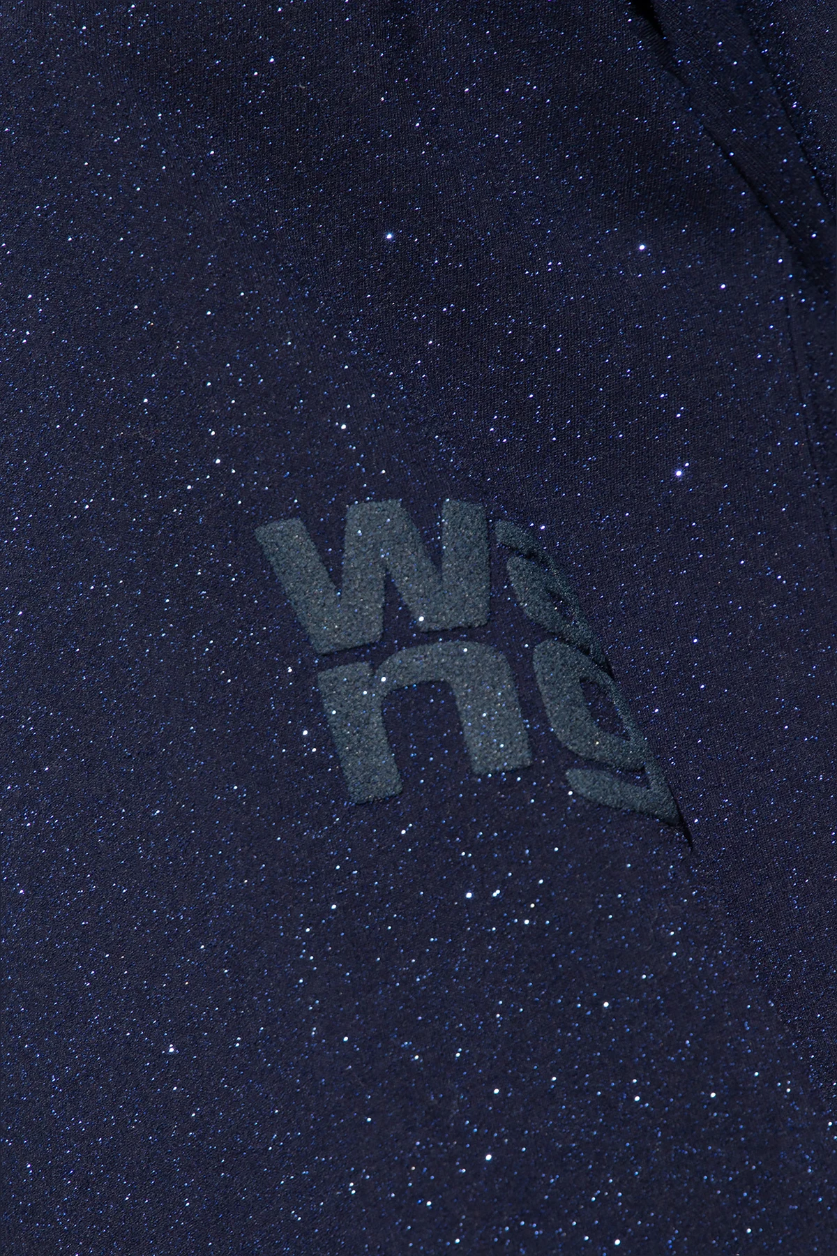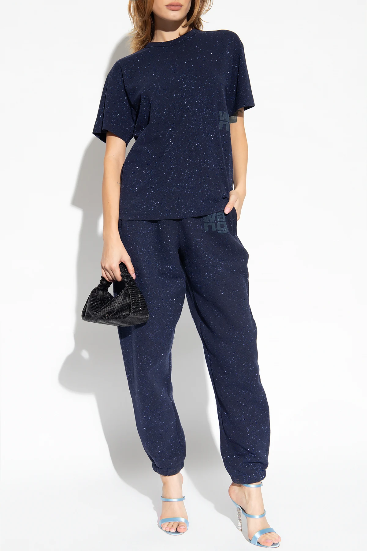 Navy blue crewneck T-shirt from T by Alexander Wang. Crafted from glittery cotton jersey, this style features a graphic print with the designer's logo, short sleeves and ribbing on the collar.