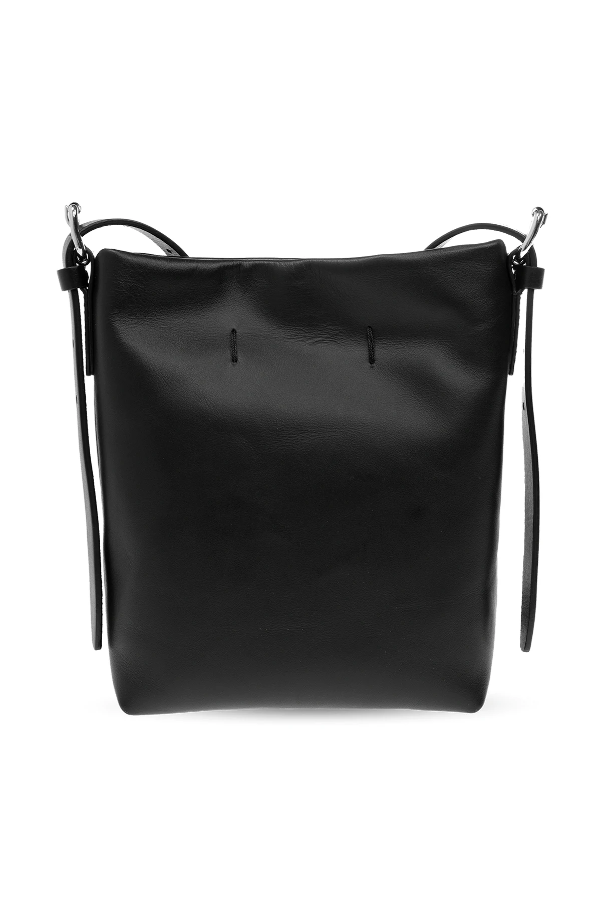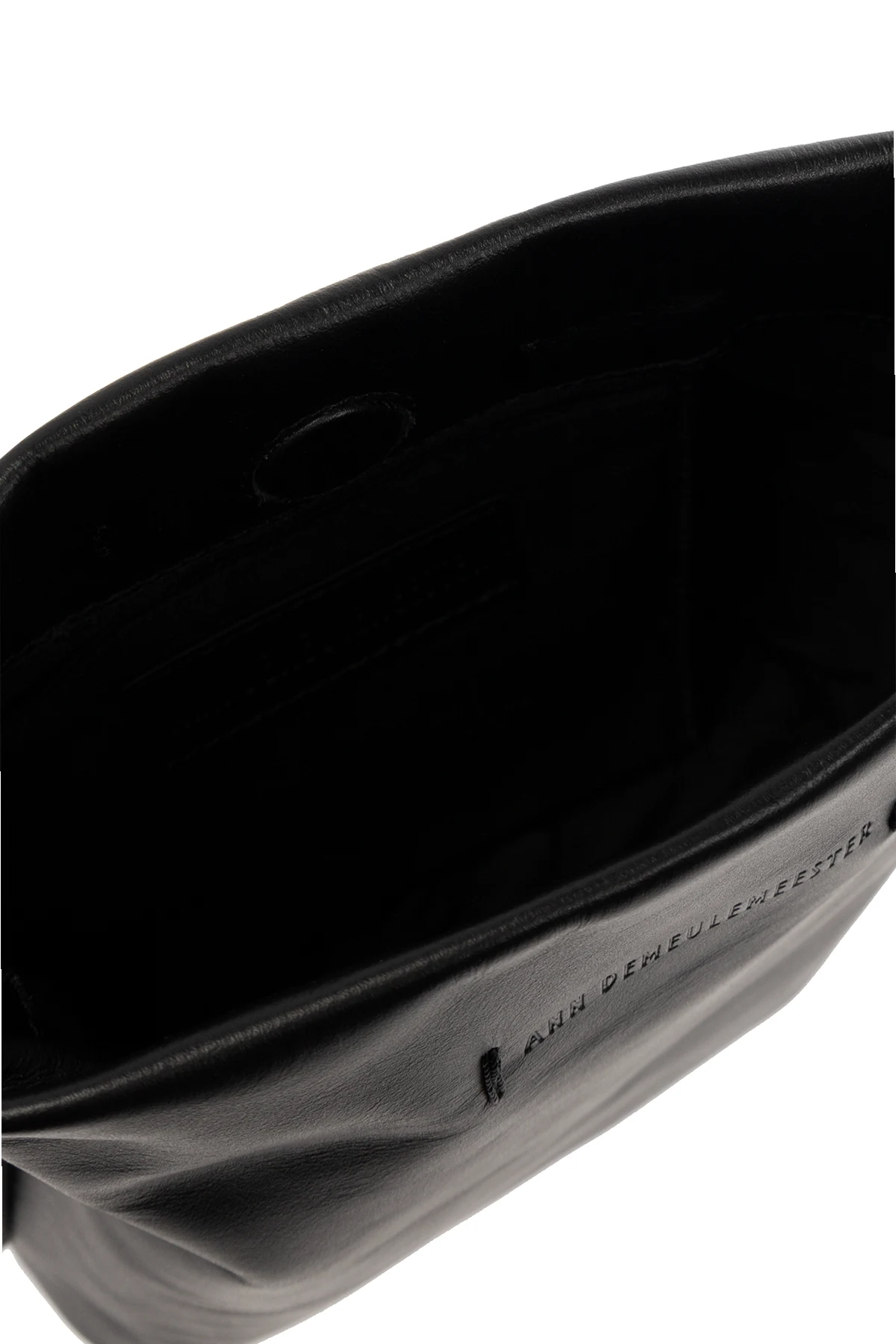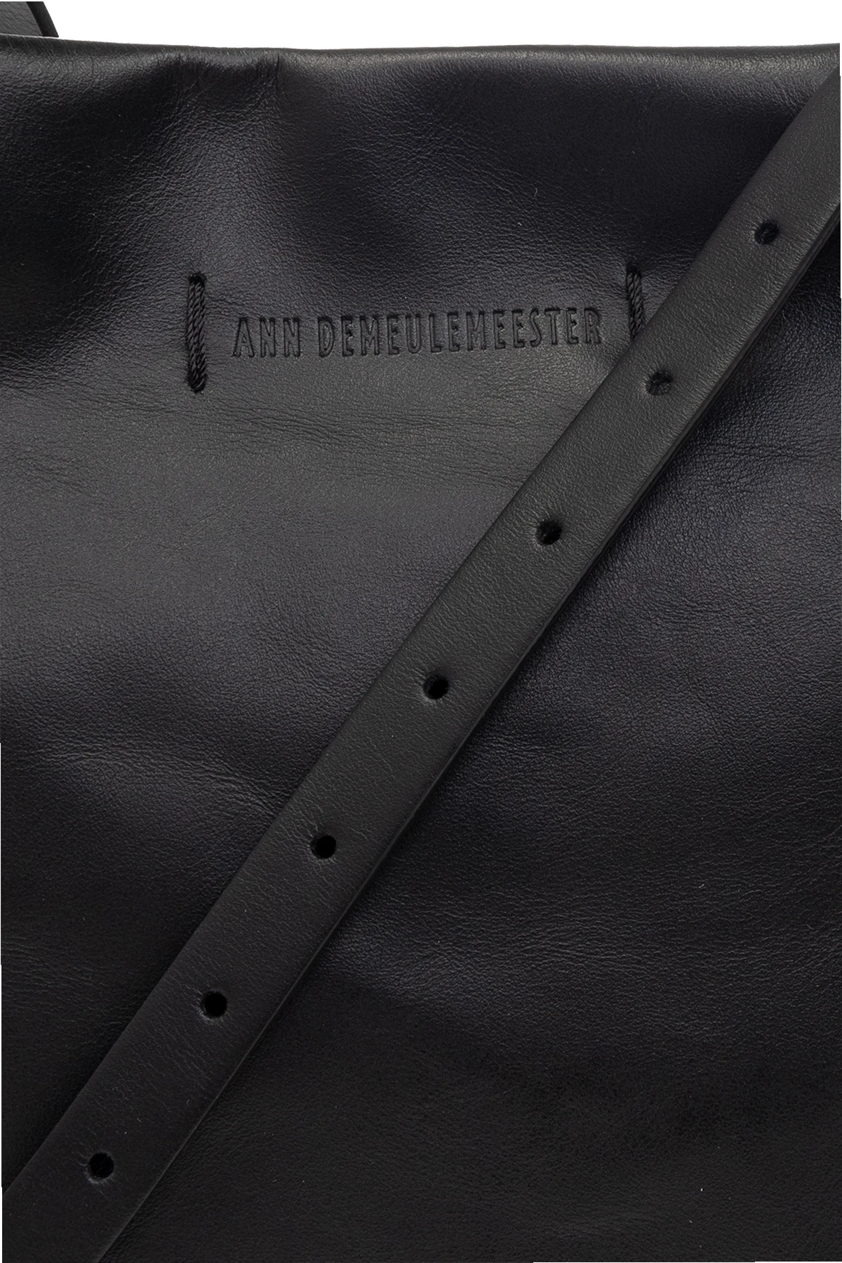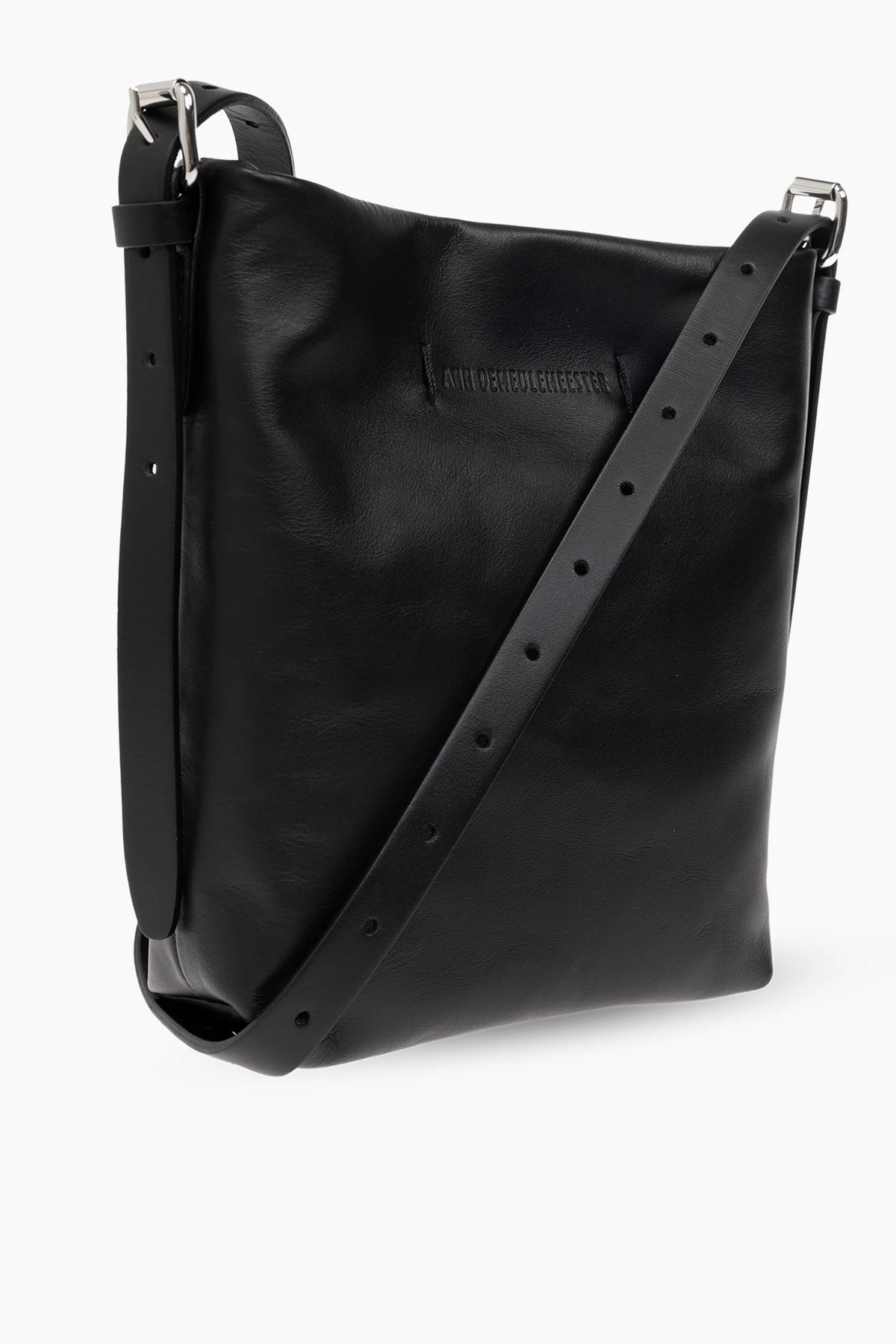 Black shoulder bag from Ann Demeulemeester. Made of calf leather, this model fastens with a magnetic snap and features an embossed logo, shoulder strap, silver-tone metal hardware and one internal compartment with one slip pocket.