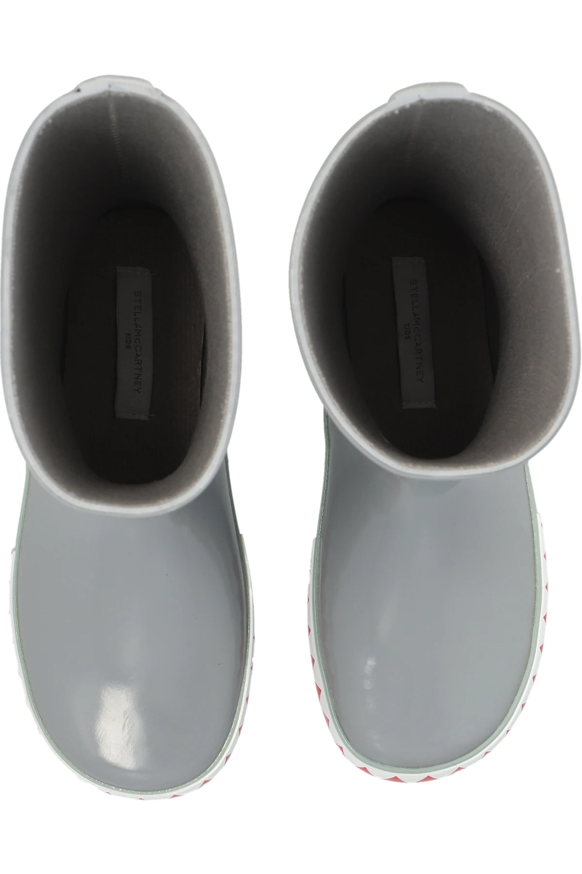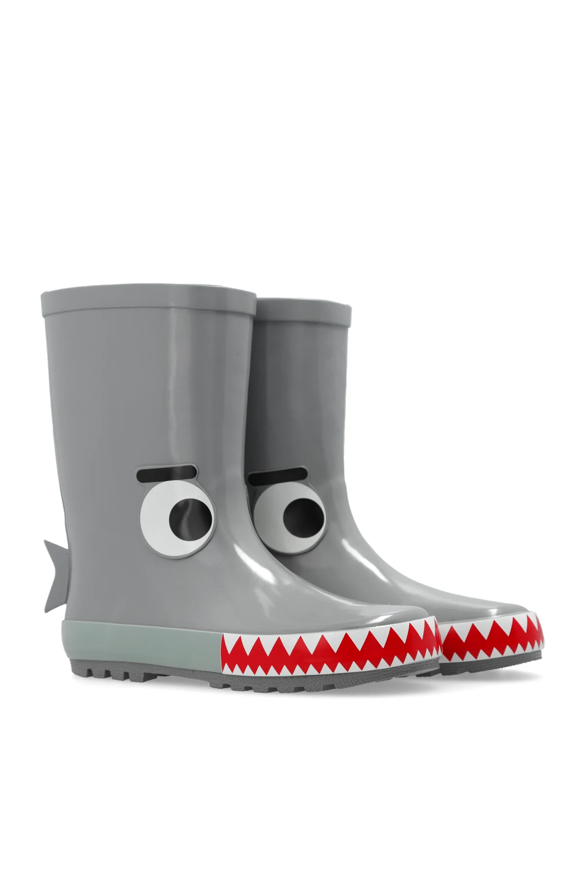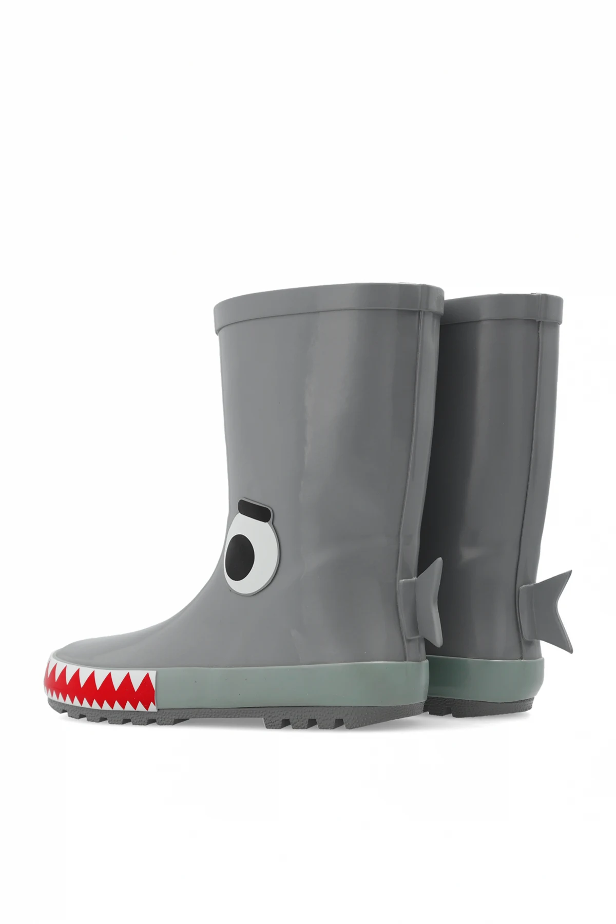 Grey slip-on rain boots from Stella McCartney Kids. Made of rubber, this slip-on pair features eye details, red and white teeth, fin at the back and rubber sole in grey and green.