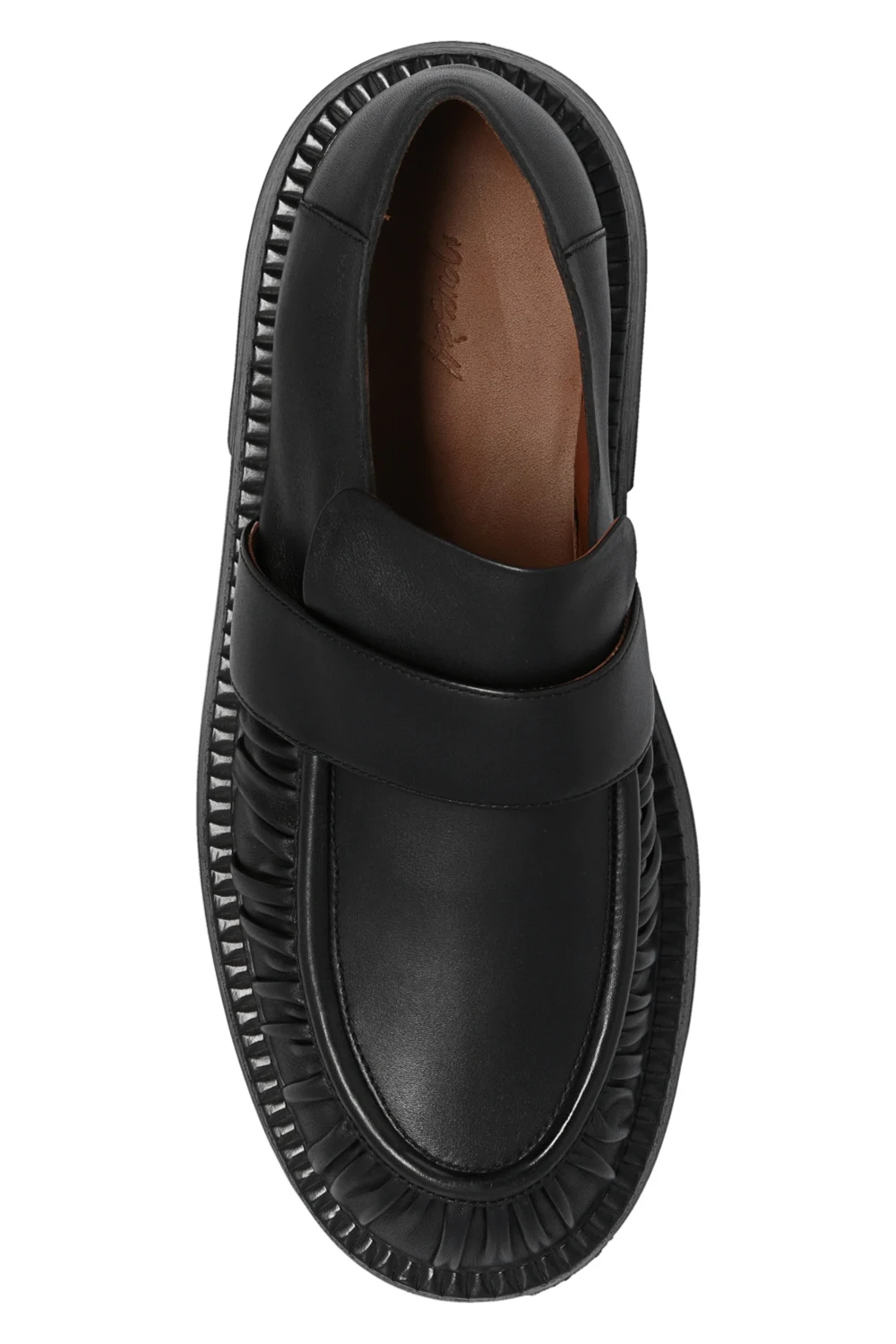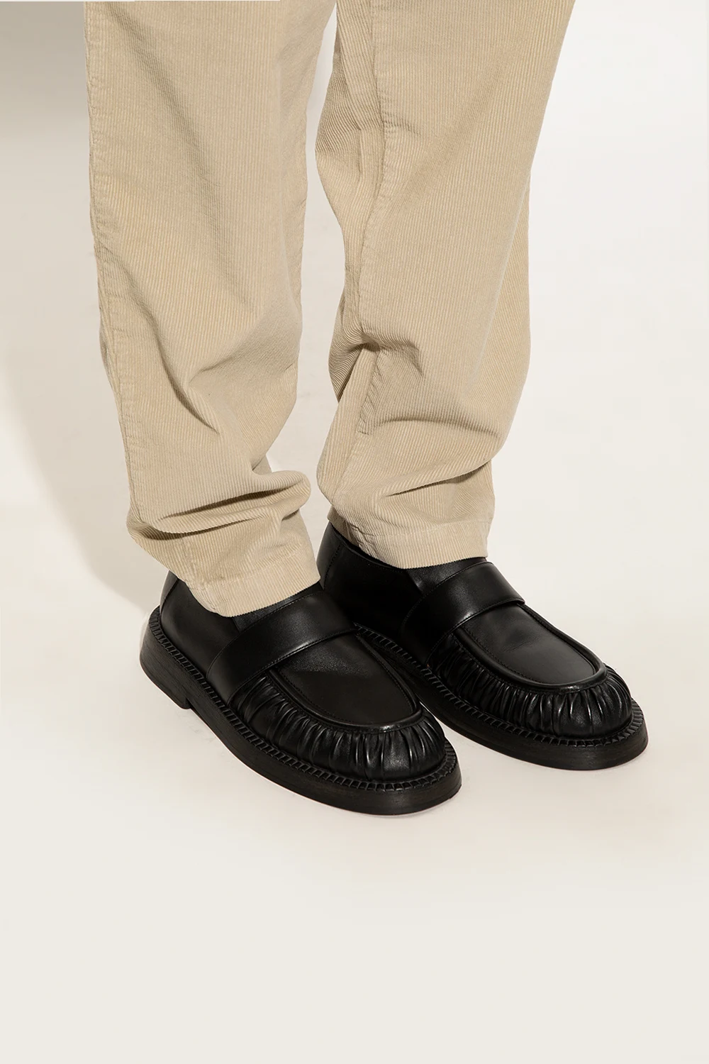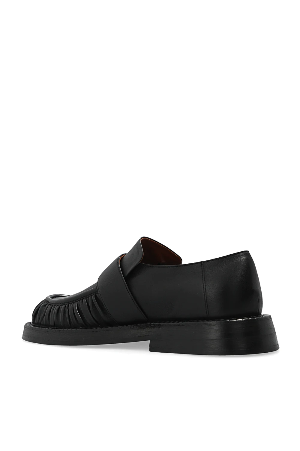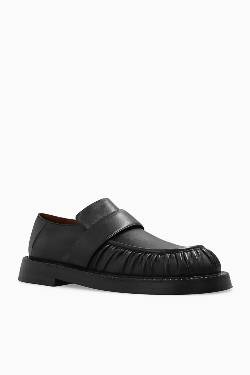 Black ‘Alluce’ slip-on shoes from Marsell. Crafted from leather, this pair is complete with decorative gathers and black rubber sole.