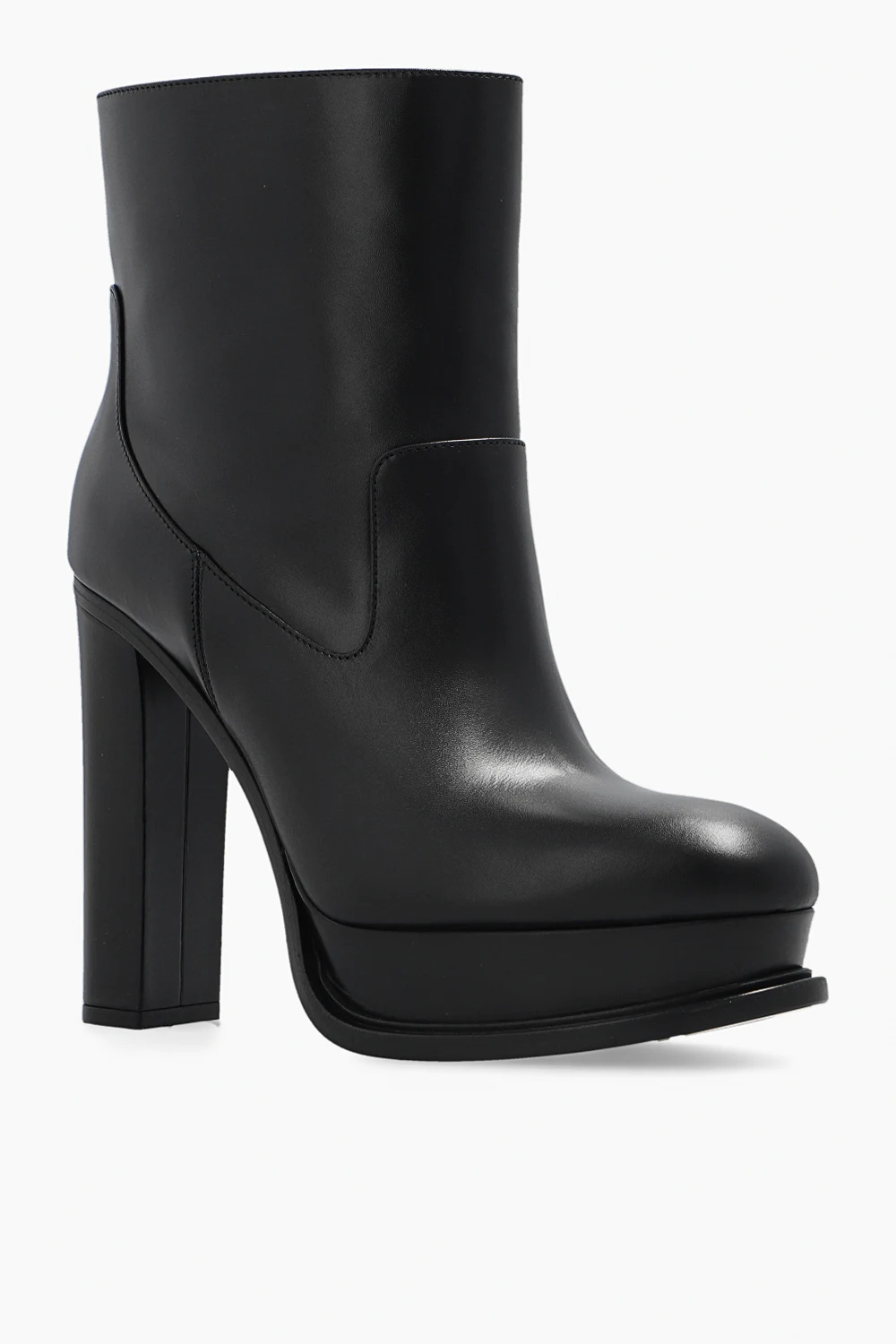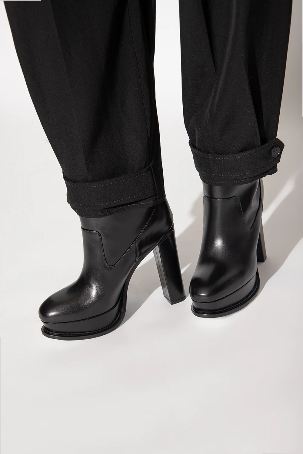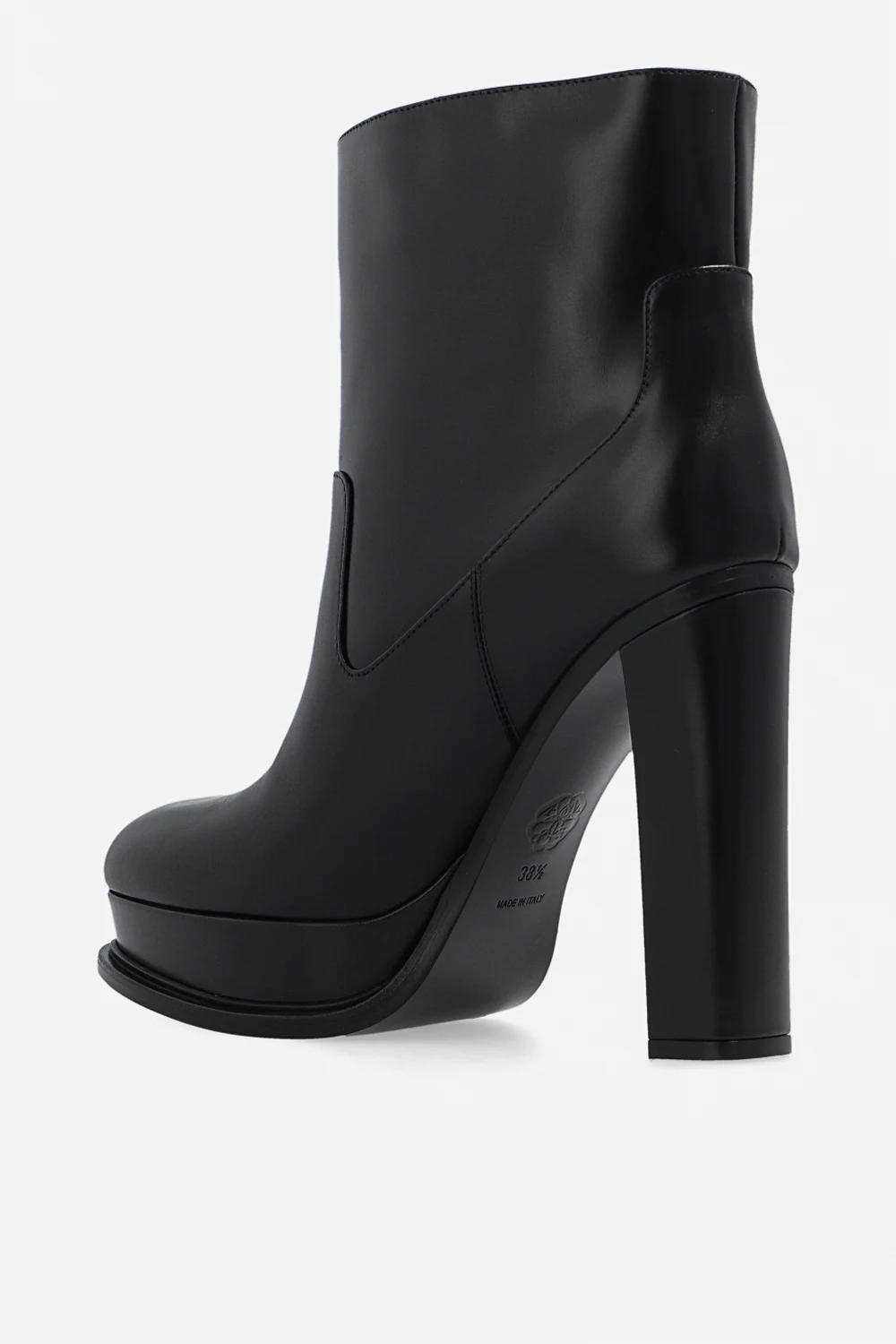 Black heeled boots from Alexander McQueen. Made of leather, this pair rests on a black leather sole.