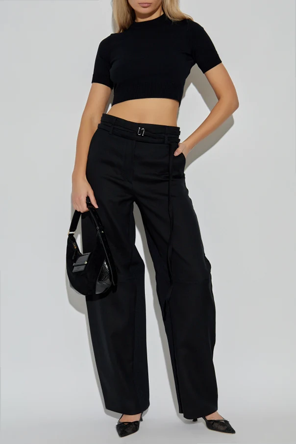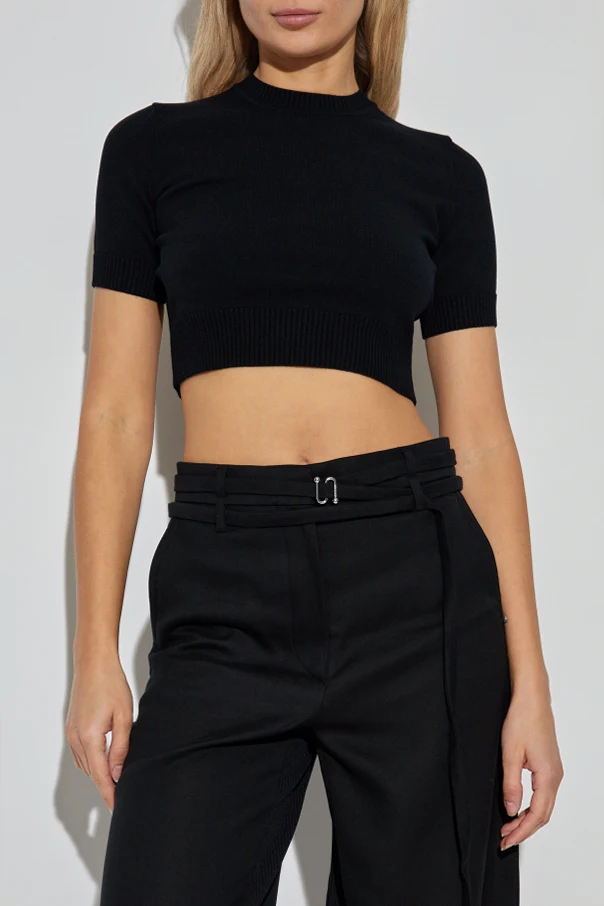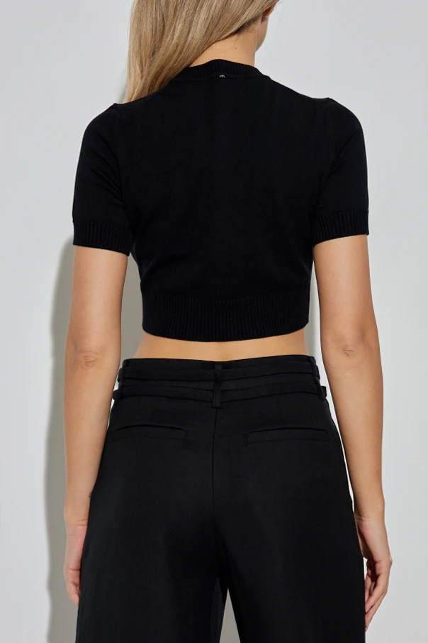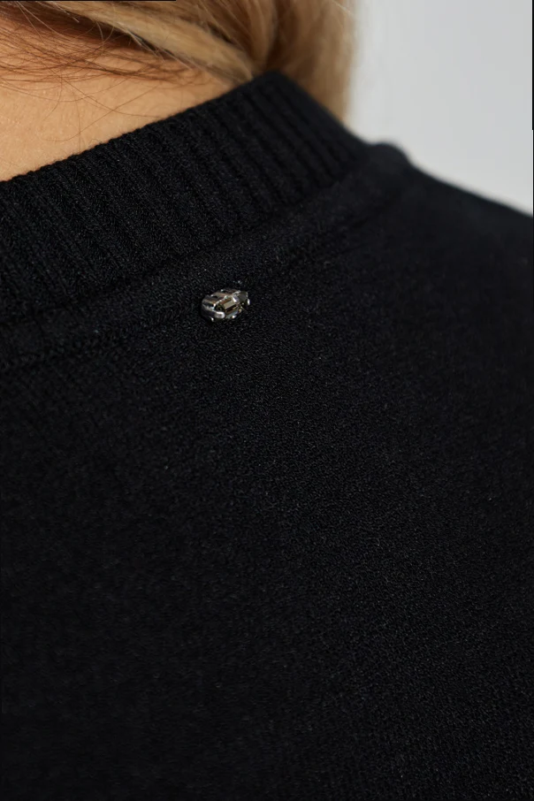 Das gesamte Design präsentiert sich in klassischem Schwarz und zeichnet sich durch gerippte Abschlüsse am unteren Saum, an den Ärmeln sowie am leicht erhöhten Ausschnitt aus. Besonders ins Auge fällt das dezente, schmuckhafte Detail – ein Mikro-Siegel mit Designerlogo, das subtil im Nacken platziert ist und die Exklusivität sowie die Sorgfalt in der Ausarbeitung jedes Kleidungsstücks mit Sportmax-Signatur unterstreicht.