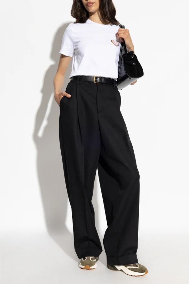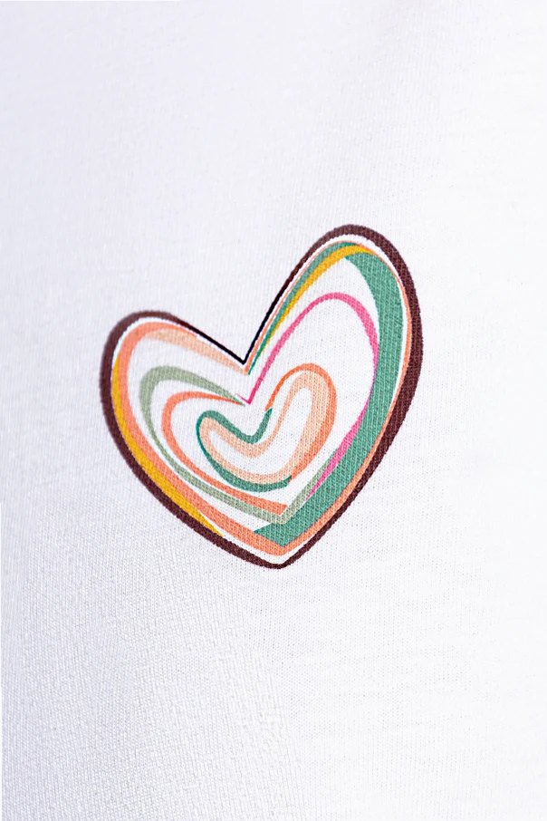 Der gerade Schnitt mit leichter Taillierung, die klassische Schulterlinie sowie die universelle Länge bis zur Hüfte verbinden auf harmonische Weise Komfort mit zeitloser Ästhetik. Das zarte Weiß des T-Shirts wird durch einen künstlerischen Print in Herzform, bestehend aus mehrfarbigen, wellenförmigen Linien, hervorgehoben. Dieses Detail zieht die Blicke auf sich und bringt einen Hauch von Freude, ohne die minimalistische Ausstrahlung des Gesamtbildes zu stören.