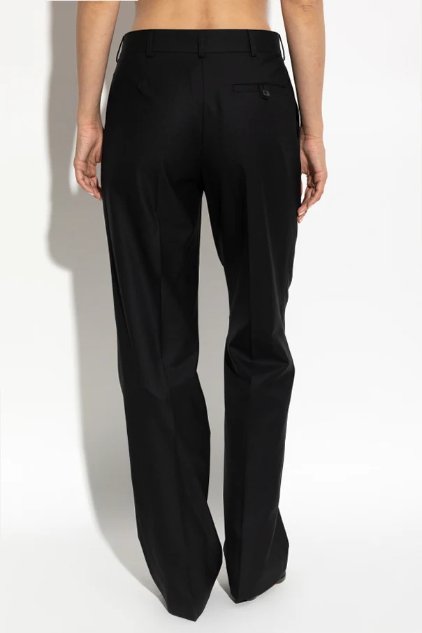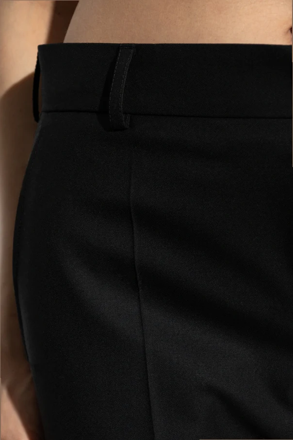 Wollhose der Marke Moschino verkörpert die raffinierte italienische Eleganz. Der klassische, gerade Schnitt mit dezent ausgestelltem Bein betont subtil die Silhouette, während die mittelhohe bis hohe Taille die Körpermitte akzentuiert und eine edle Linie schafft. Der glatte, einfarbige Stoff besteht aus hochwertigster Wolle, deren Struktur nicht nur für eine zeitlose Optik, sondern auch für einen angenehmen Tragekomfort sorgt.