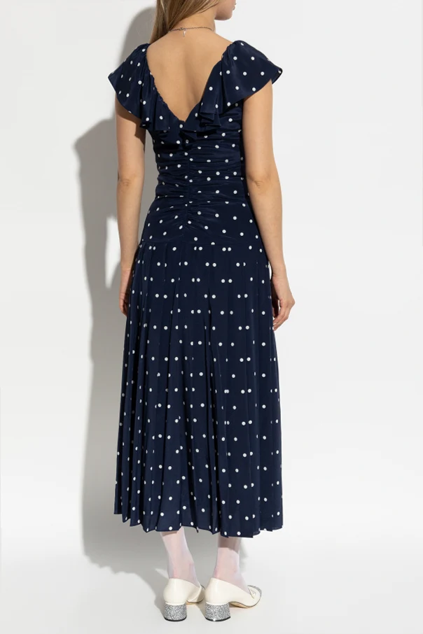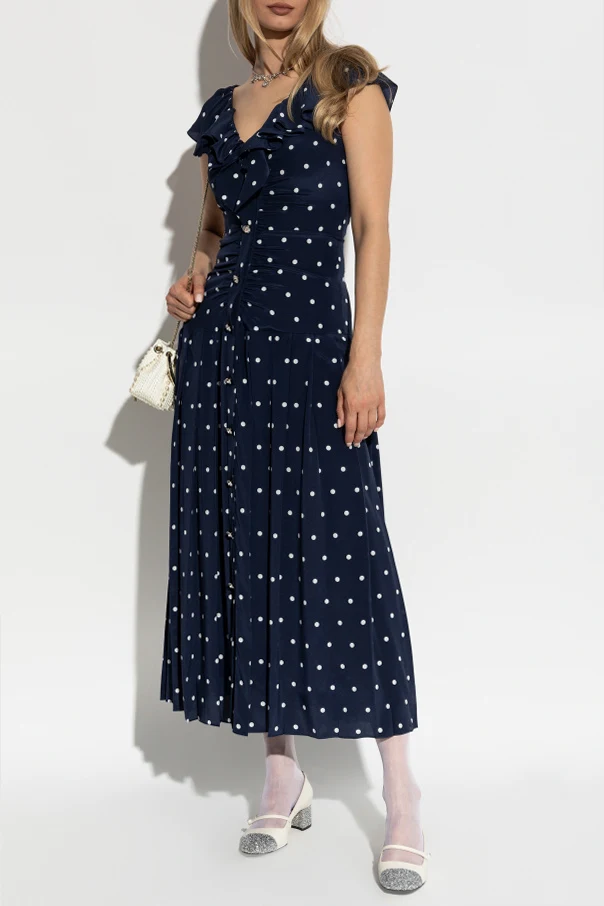 Kleid mit Polka-Dot-Muster ist die Verkörperung raffinierter Klassik, in der Eleganz auf zeitlose Weiblichkeit trifft. Das Design von Alessandra Rich zieht mit einem tiefen Marineblau als Hintergrund die Blicke auf sich, das subtil von einem regelmäßigen, weißen Polka-Dot-Muster erhellt wird und so einen besonders faszinierenden Kontrast schafft.
