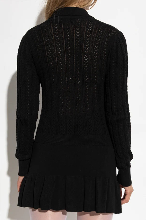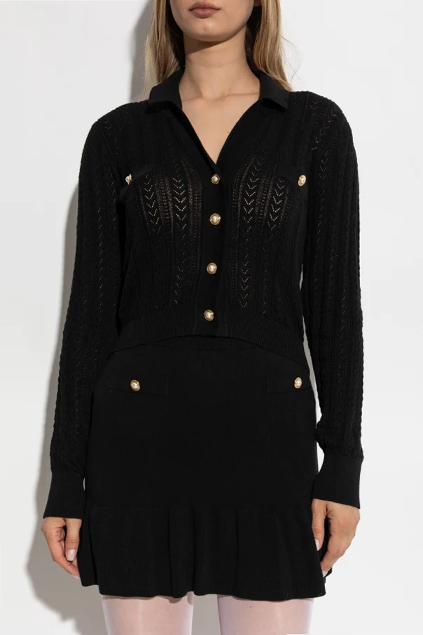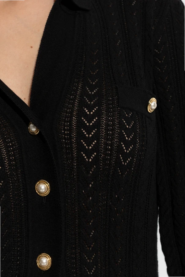 Weiches, luxuriöses Strickmaterial aus edler Baumwolle mit einem Hauch von Kaschmir bietet außergewöhnliche Leichtigkeit und Elastizität. Das markante, durchbrochene Muster mit Chevron-Motiv verleiht dem Gesamtbild subtile Raffinesse. Fünf dekorative Knöpfe in goldener Fassung mit weißer Perle setzen einen einzigartigen Schmuckakzent und unterstreichen den exklusiven Charakter des Modells.