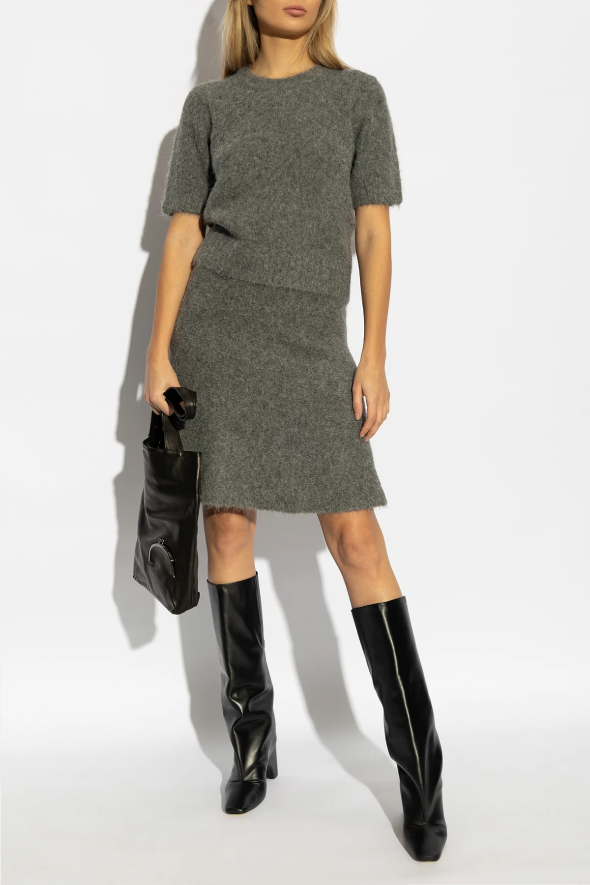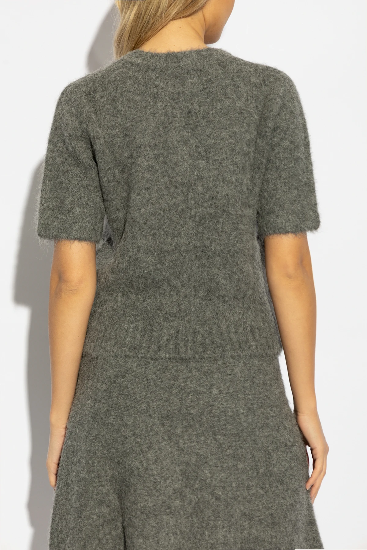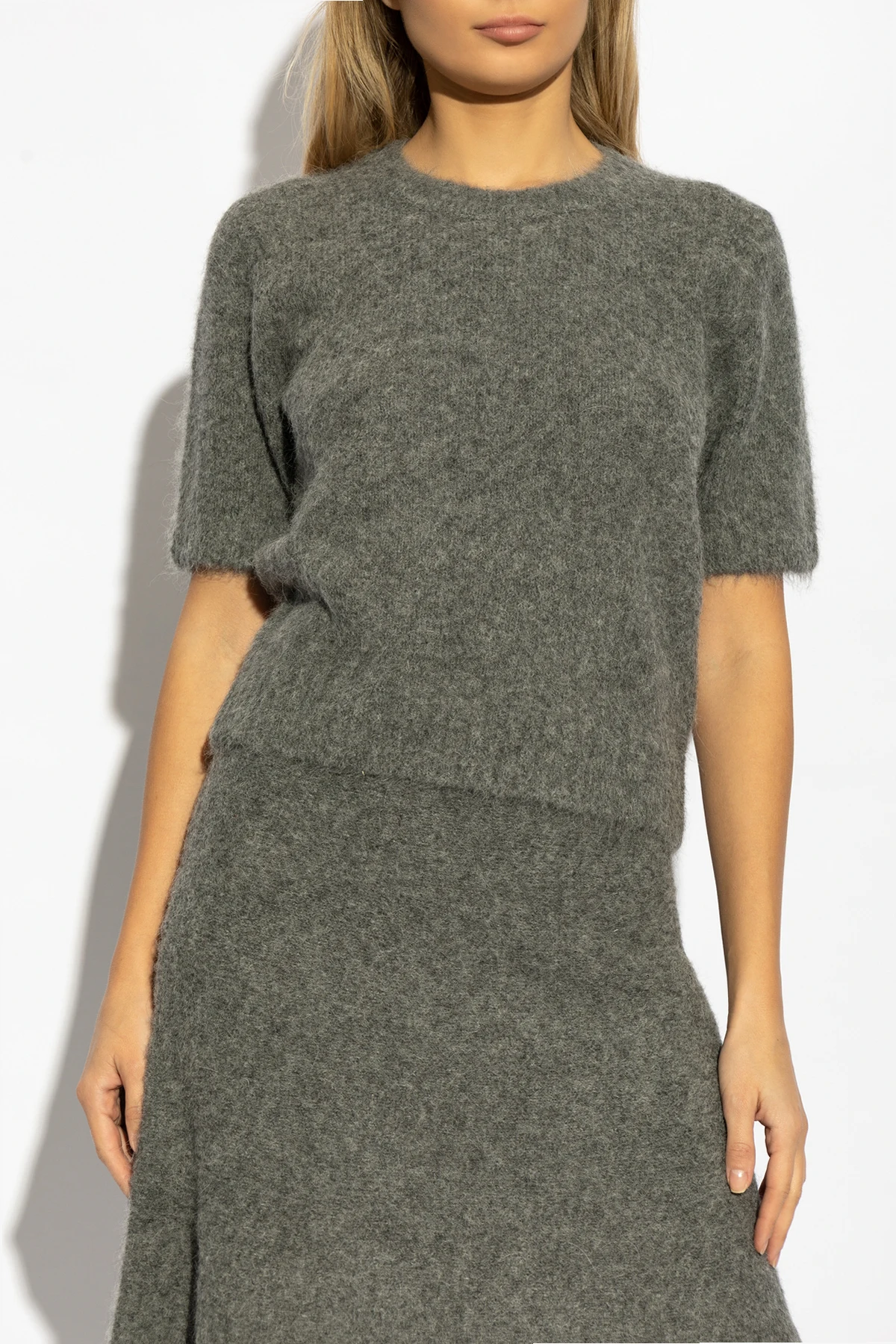 Das Top zeichnet sich durch einen klassischen Schnitt mit kurzen Ärmeln und rundem Halsausschnitt aus, der die Silhouette perfekt betont. Die nahtlose Verarbeitung und das Fehlen sichtbarer Nähte unterstreichen seine subtile Eleganz und zeitlose Stil. Die einheitliche graue Farbe macht es zu einem universellen Vorschlag, ideal für jeden Anlass.