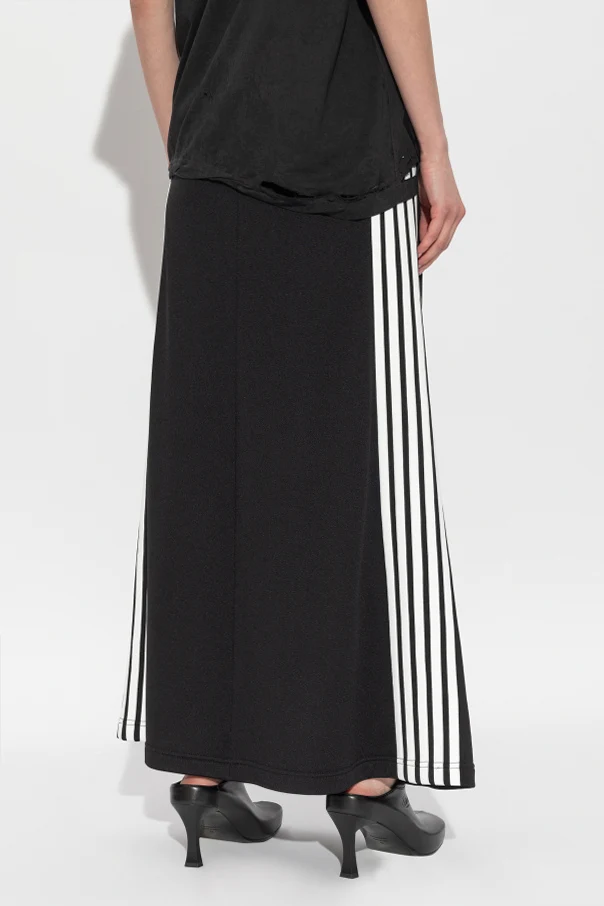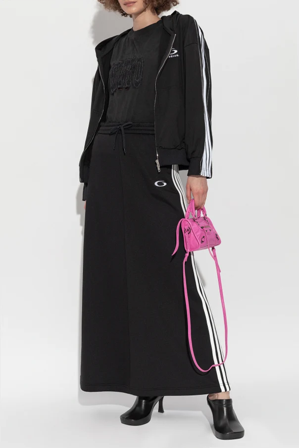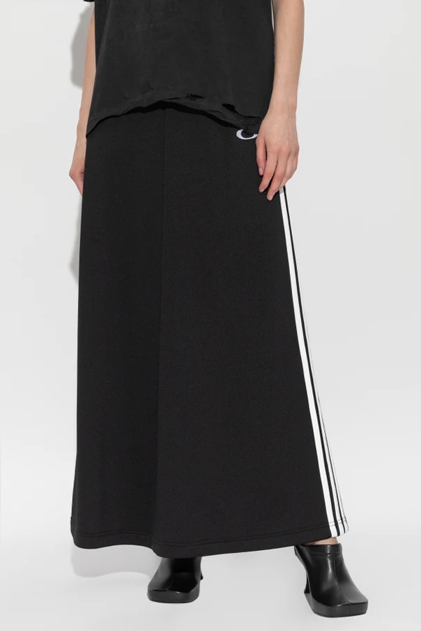 Logo-Rock aus dem Hause Balenciaga ist eine außergewöhnliche Verbindung aus moderner Handwerkskunst und sportlicher Lässigkeit. Das klassische Schwarz, bereichert durch kontrastierende, doppelte weiße Paspeln entlang der Seiten, verleiht diesem langen, leicht ausgestellten Rock in A-Linien-Silhouette einen unverwechselbaren, dynamischen Charakter.