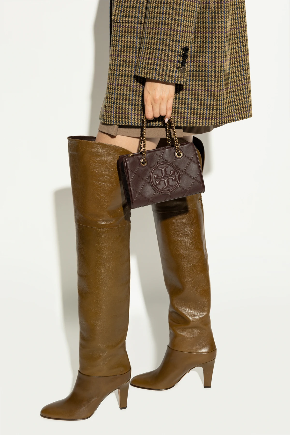 Wir präsentieren die exklusive Schultertasche Fleming Soft Mini aus der Kollektion der renommierten Marke Tory Burch . Diese kleine Tasche, die für Frauen bestimmt ist, begeistert mit Eleganz und Raffinesse. Hergestellt aus hochwertigem Leder in dominierendem dunkelbraunen Farbton, vereint sie Haltbarkeit mit luxuriösem Aussehen.