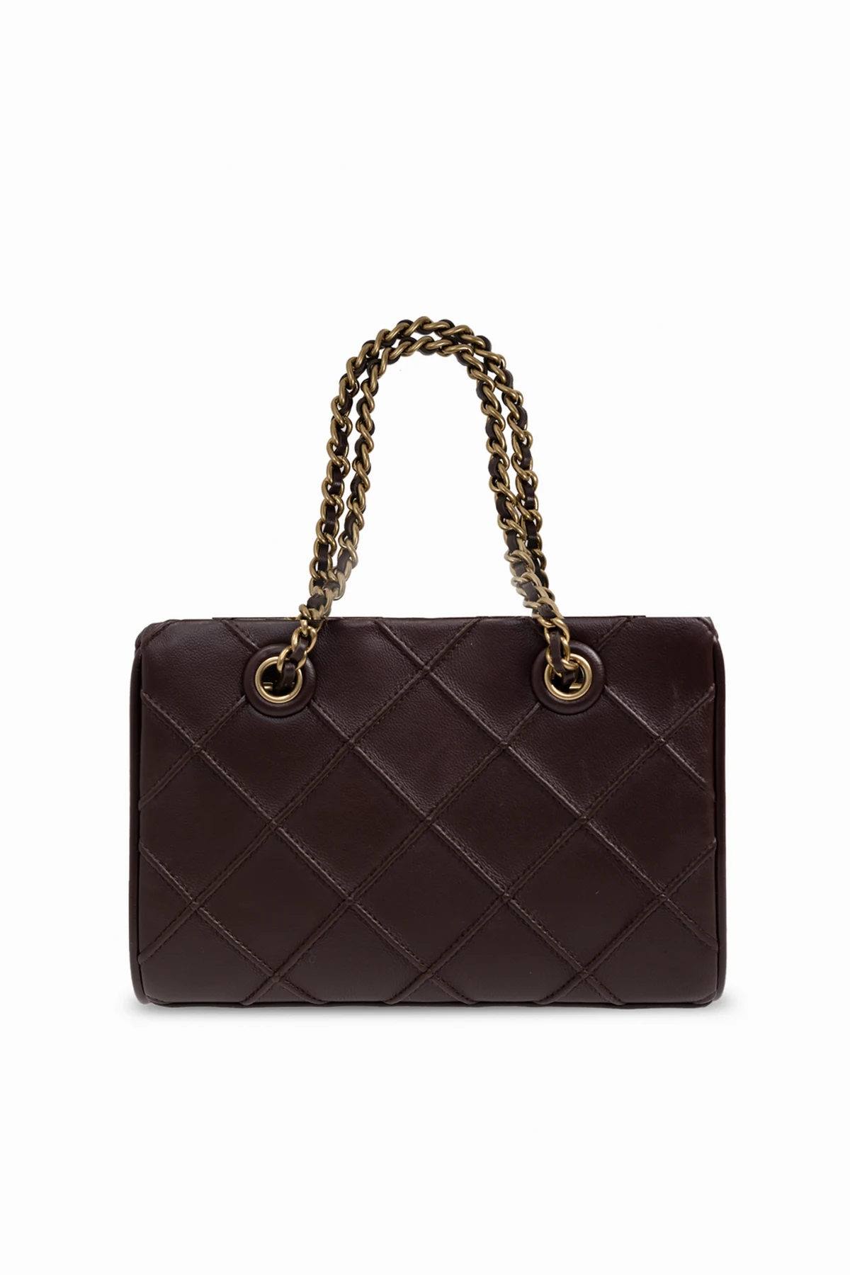 Das charakteristische gesteppte Rautenmuster und das große, erhabene Designer-Logo auf der Vorderseite der Tasche verleihen ihr einen einzigartigen Charakter. Die Griffe aus einer goldfarbenen Metallkette, die mit Lederstücken durchzogen sind, unterstreichen nicht nur die Eleganz, sondern sorgen auch für einen angenehmen Tragekomfort.