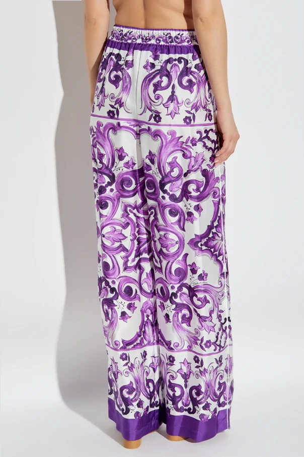 Besonders ins Auge fällt das ornamentale Majolica-Muster – eine einzigartige Komposition aus violetten floralen Motiven, inspiriert von italienischer Kunstkeramik, mit einem kontrastierenden Saumabschluß an den Hosenbeinen. Die exklusive Vision von Dolce & Gabbana kombiniert mit höchster Verarbeitungsqualität macht diese Hose zu einem außergewöhnlichen Juwel in jeder Garderobe.