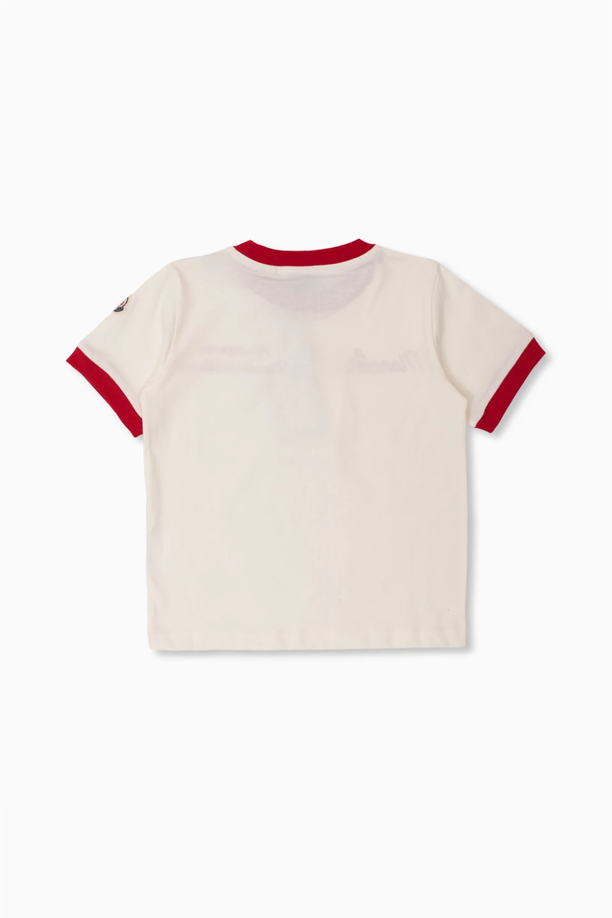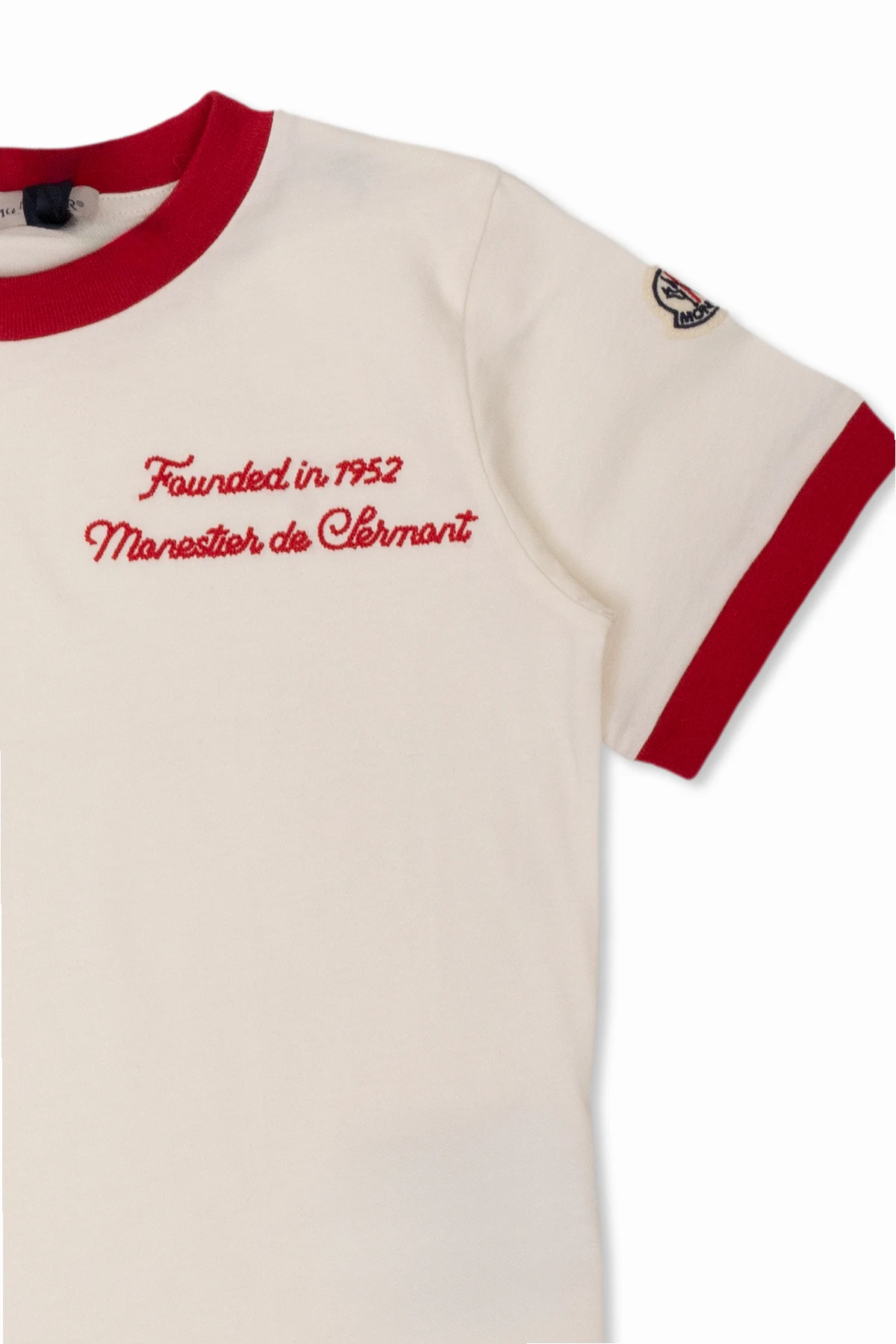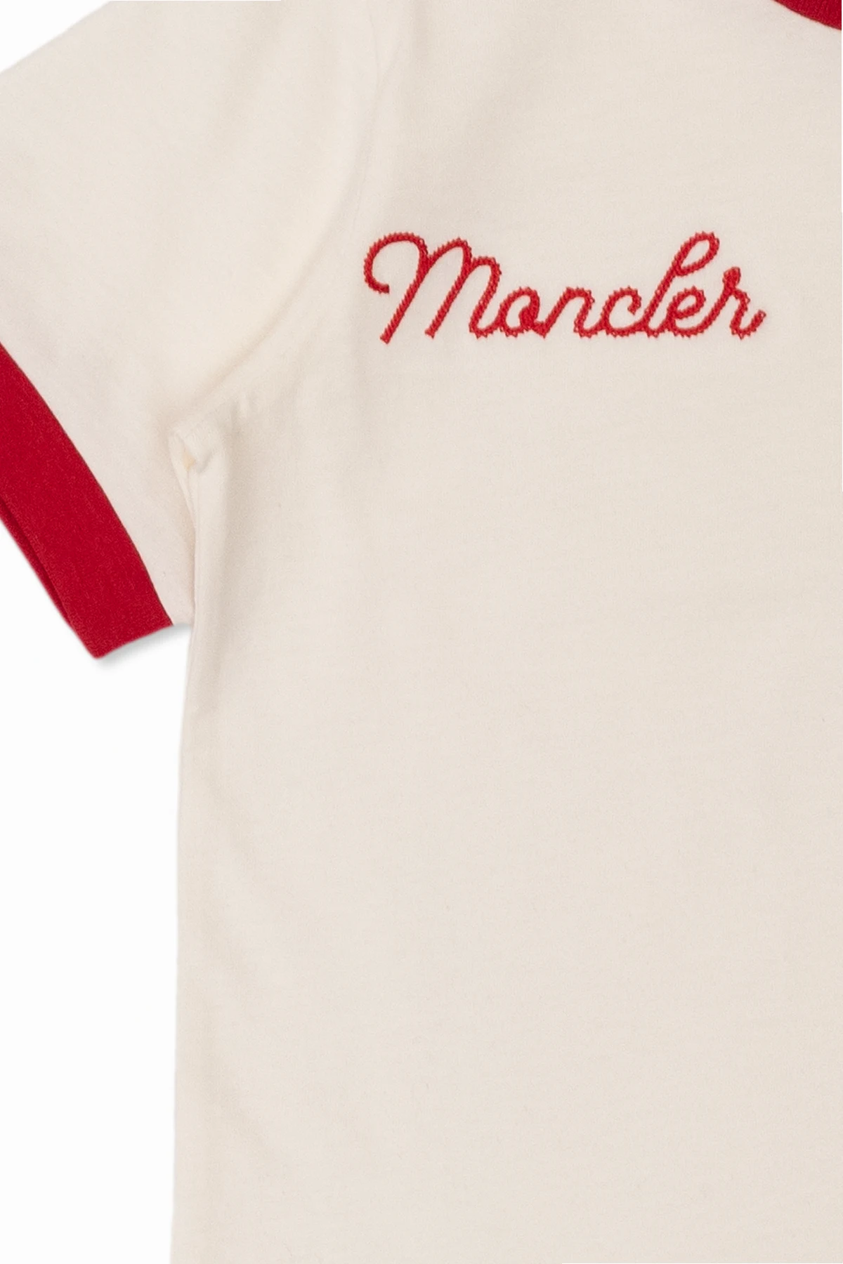 White and red T-shirt from Moncler Kids. Made of cotton, this style features an embroidered logo and ribbing on the round neck and short sleeves.