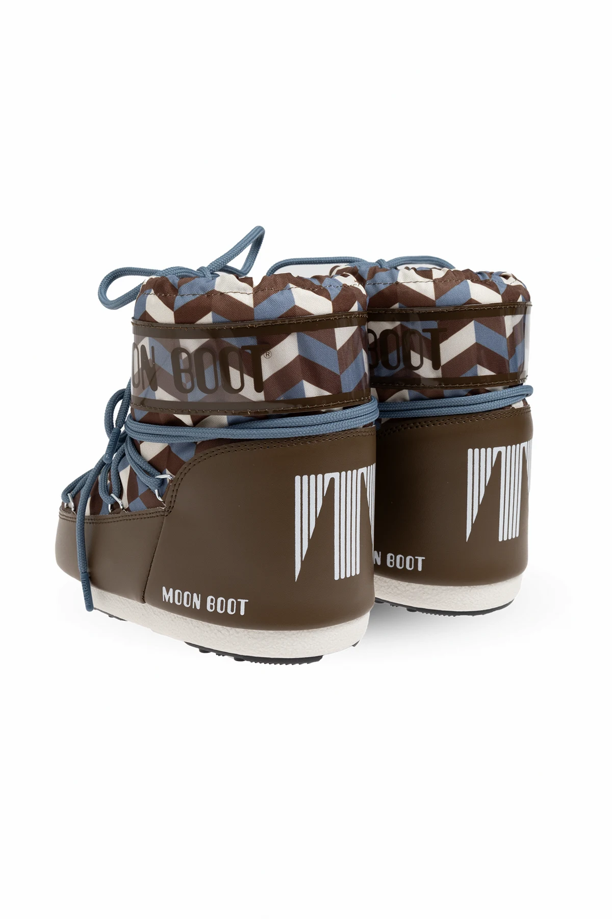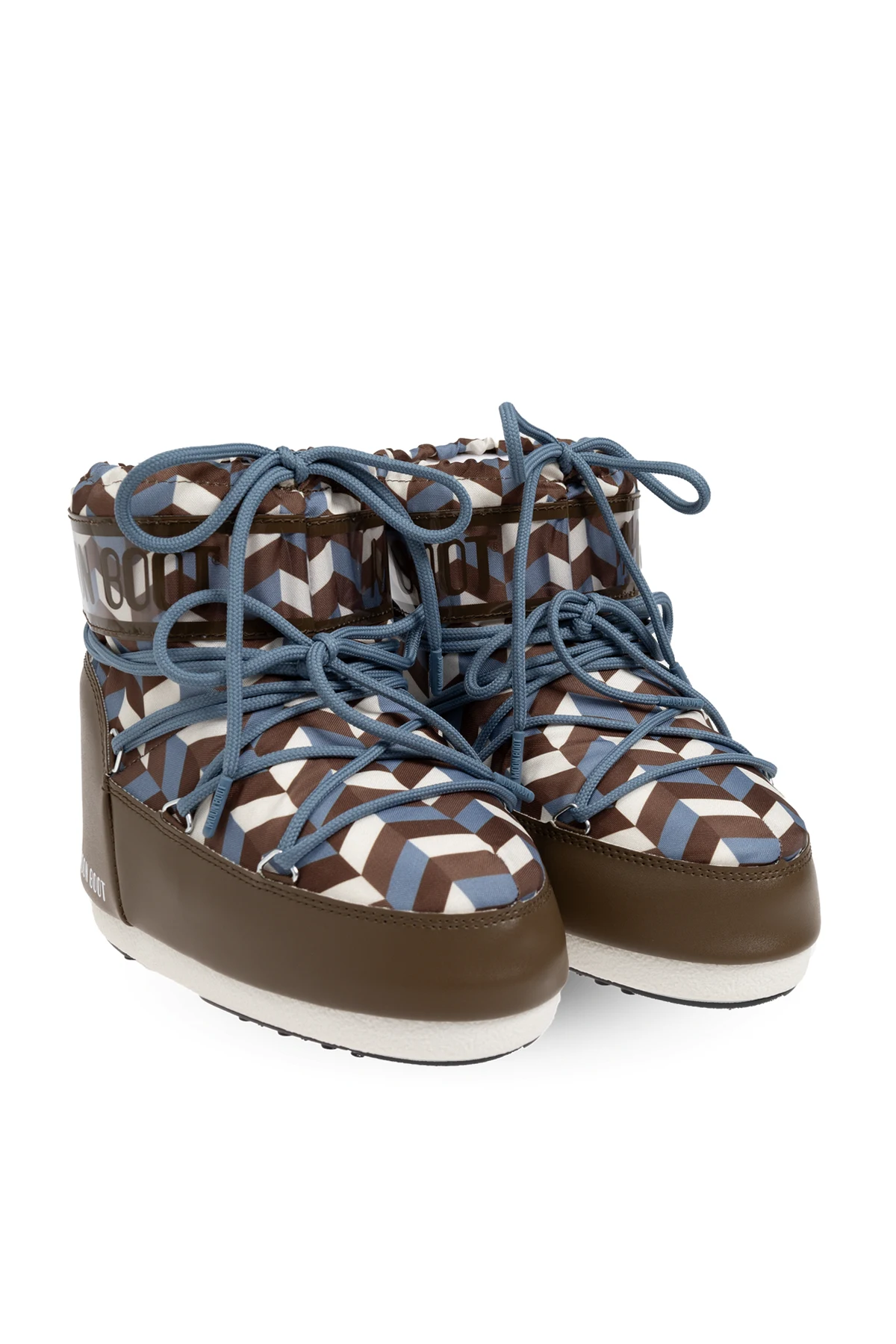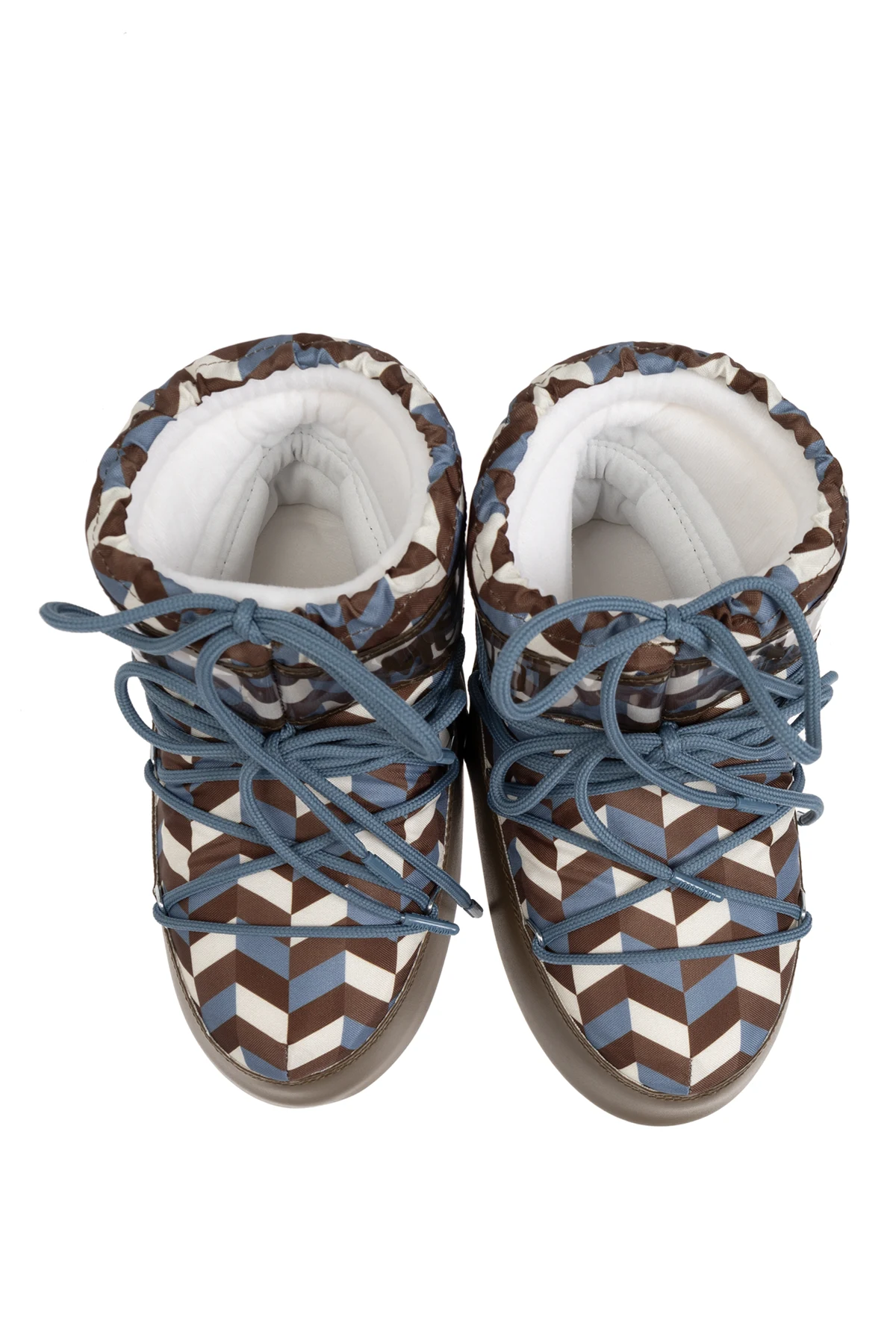 Die dominierende Farbe ist Braun, ergänzt durch Schattierungen von Blau und Weiß, und das geometrische Muster aus Rechtecken und Quadraten verleiht ihnen einen einzigartigen Charakter. Das Obermaterial, eine Kombination aus Stoff und synthetischen Elementen, garantiert Wasserbeständigkeit und Haltbarkeit. Auf dem oberen und unteren Teil des Schafts befinden sich die Schriftzüge „MOON BOOT“, die den Prestige der Marke unterstreichen.