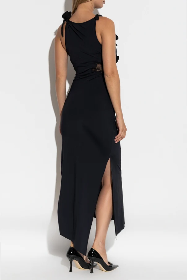 Ein Blickfang ist die dekorative Applikation in Form einer Stoffrose oberhalb der Brustlinie sowie sinnliche, subtile Ausschnitte in der Spitze, die sich direkt unter der Brust und am Ausschnitt befinden. Der Stoff besticht durch seine hochwertige Qualität und seinen Glanz, während die Details handwerkliche Perfektion zeigen und zugleich an die architektonischen Inspirationen der Marke erinnern.