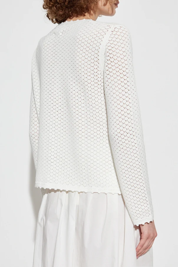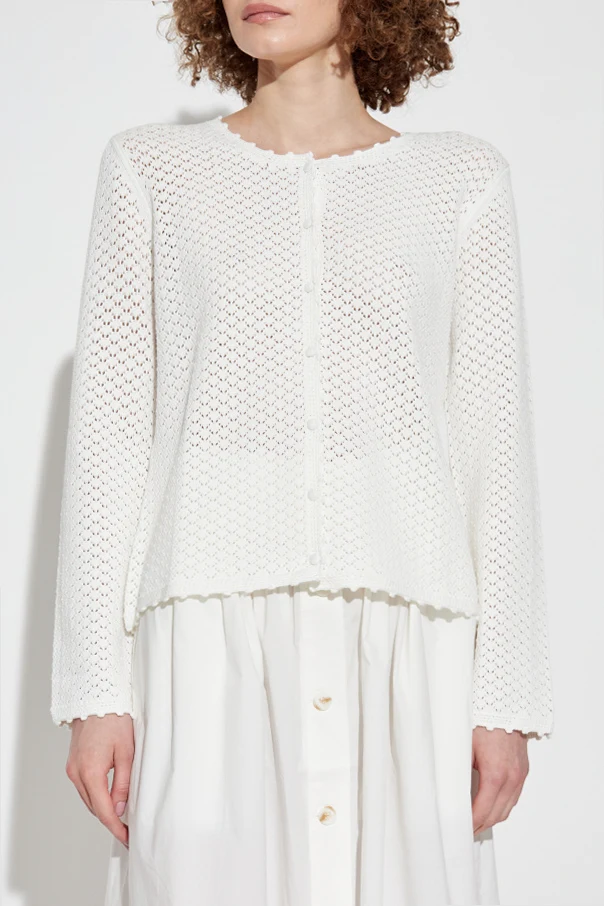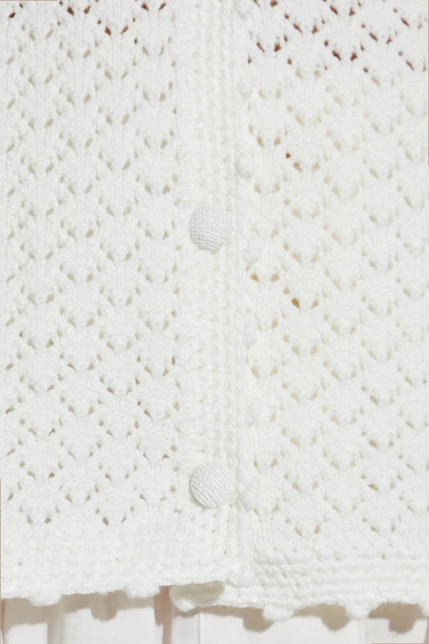 Eine zarte Mischung natürlicher Fasern ist in höchster Perfektion verarbeitet – die matte, gehäkelte Struktur des Cardigans begeistert durch ihre Noblesse. Der aus der Ferne unsichtbare, stoffbezogene Knopfverschluss fügt sich harmonisch in das Gesamtbild ein. Dekorative, gewellte Abschlüsse verleihen dem Ausschnitt, den Ärmelbündchen und dem Saum des Cardigans eine besondere Anmut.