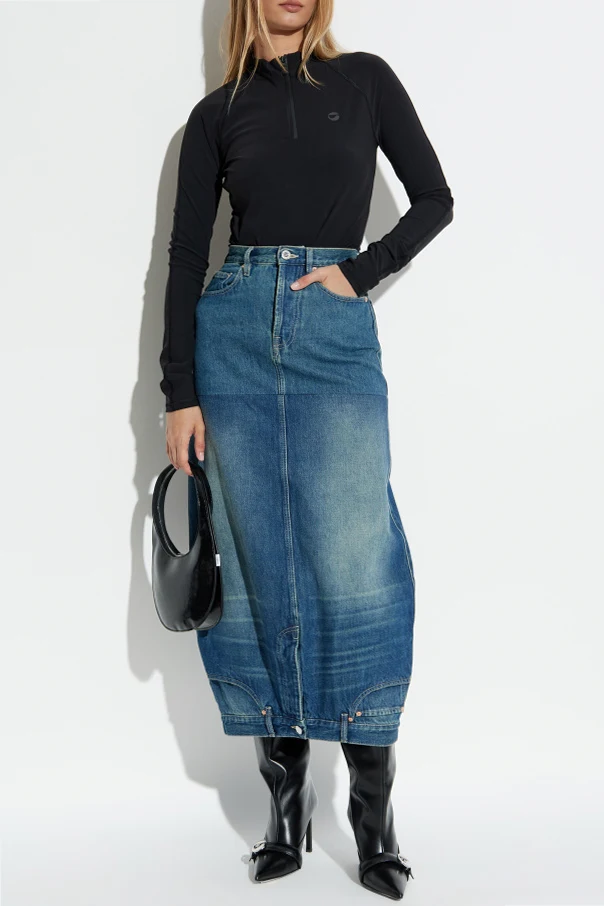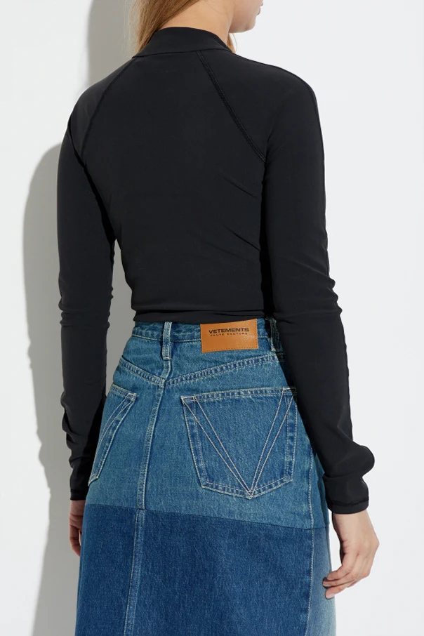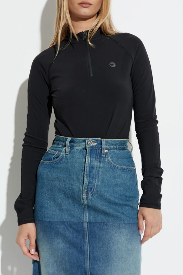 Langärmeliger Body von Coperni ist eine raffinierte Wahl für anspruchsvolle Frauen, die die Verbindung von modernem Minimalismus und Funktionalität schätzen. Das innovative, glatte Material besticht durch eine subtile, matte Oberfläche und edle Elastizität, die sich harmonisch an die Silhouette anschmiegt. Der ergonomische Schnitt mit hohem, leicht stehendem Kragen und Raglanärmeln sorgt für Bewegungsfreiheit und betont die Körperlinie perfekt.