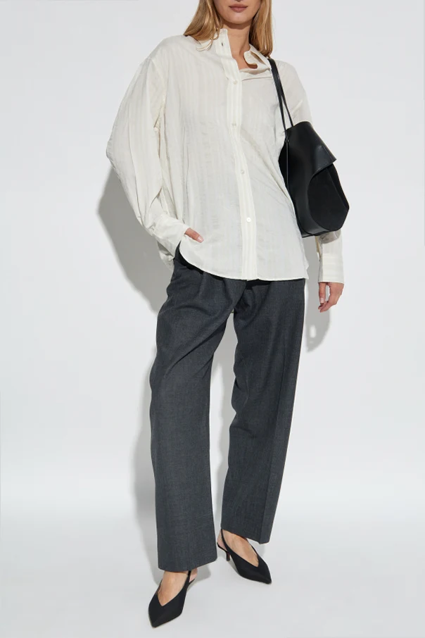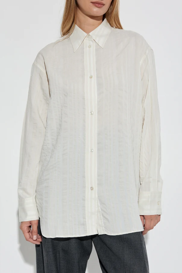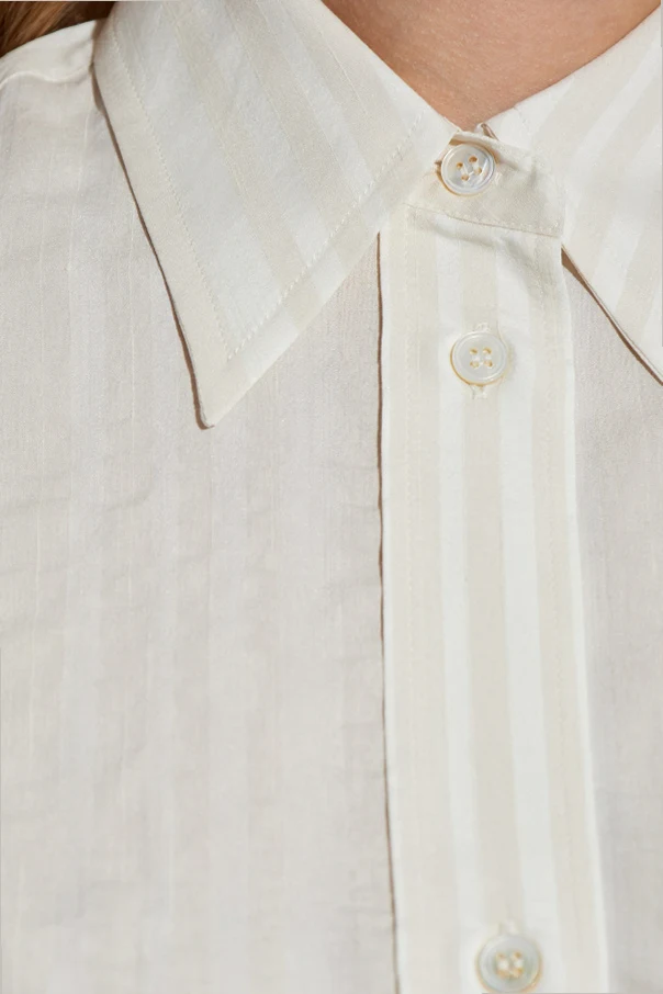 Das Material ist eine edle Mischung aus Seide und Viskose mit einer dezenten Jacquard-Struktur. Vertikale, unregelmäßige Streifen in cremefarbenen Nuancen, kombiniert mit der zarten Transparenz des Stoffes, unterstreichen den exklusiven Charakter des Hemdes. Die präzise Verarbeitung sowie die cremefarbenen Knöpfe zeugen von höchster Liebe zum Detail.