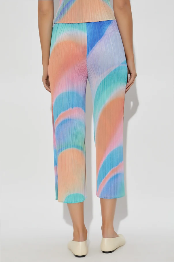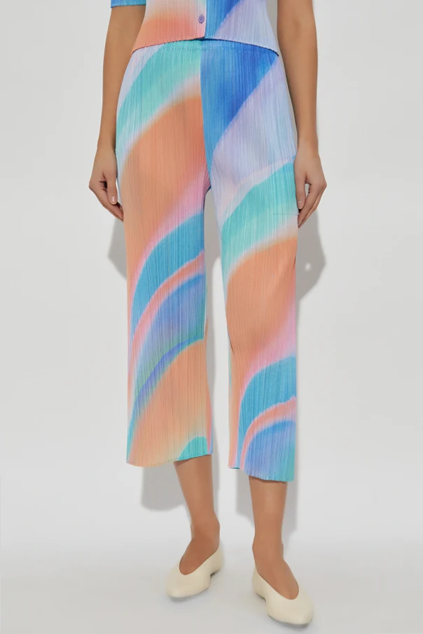 Die plissierten Hosen der Marke Pleats Please Issey Miyake verkörpern höchste Form avantgardistischer Eleganz. Ihr klassischer, geradliniger Schnitt betont dezent die Silhouette, während die knöchellangen, weiten und nicht anliegenden Beine außergewöhnliche Bewegungsfreiheit bieten.