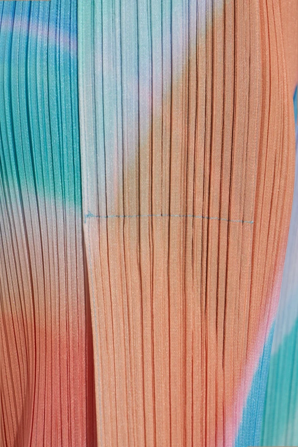 Das wirkungsvolle, abstrakte Muster im Tie-Dye-Stil ist eine künstlerische Interpretation von Aquarellmotiven und vereint harmonisch pastellfarbene Nuancen von Blau, Pfirsich, Orange, Grün und Weiß. Vertikale, regelmäßige Plisseefalten, hergestellt durch innovative Techniken, verbinden traditionelles japanisches Handwerk mit moderner Ästhetik und verleihen dem Stoff (synthetisches Polyester mit edlem Glanz) eine originelle Struktur.