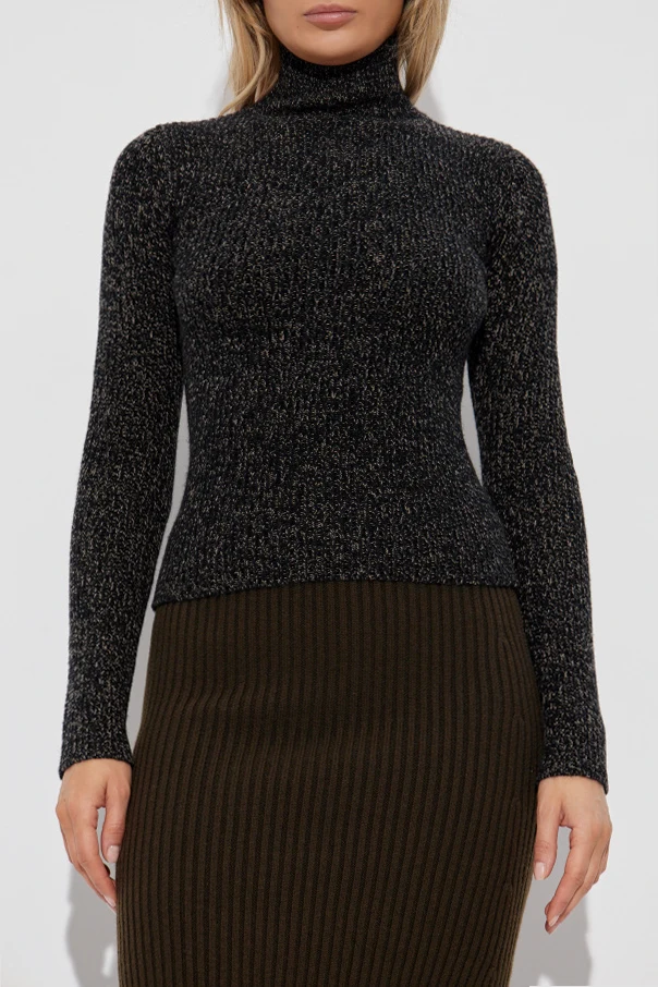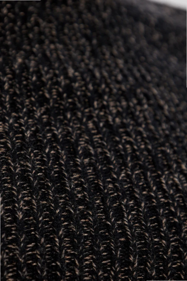 Gefertigt aus einem voluminösen, leicht elastischen Strick mit ausgeprägter, gerippter Struktur, fasziniert er durch seine melierte Textur – Schwarz, durchbrochen von helleren Fäden, schafft einen subtilen Kontrasteffekt. Der Pullover fühlt sich angenehm an, schmiegt sich an und sorgt für ein komfortables Tragegefühl, während der zarte Glanz des Stoffes seinen luxuriösen Charakter hervorhebt. Das Modell zeichnet sich durch eine puristische Detailgestaltung aus: Der Verzicht auf Taschen, Knöpfe und Reißverschlüsse verleiht ihm raffinierte Schlichtheit und eine zeitlose Form.