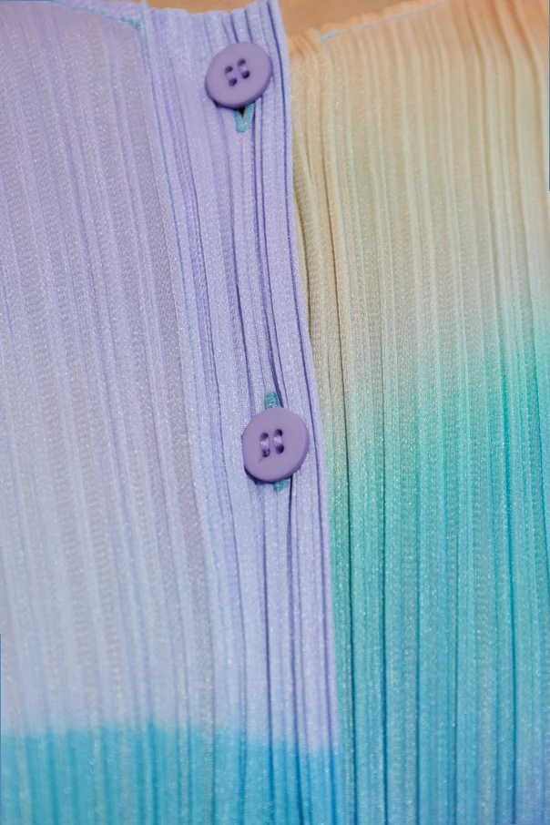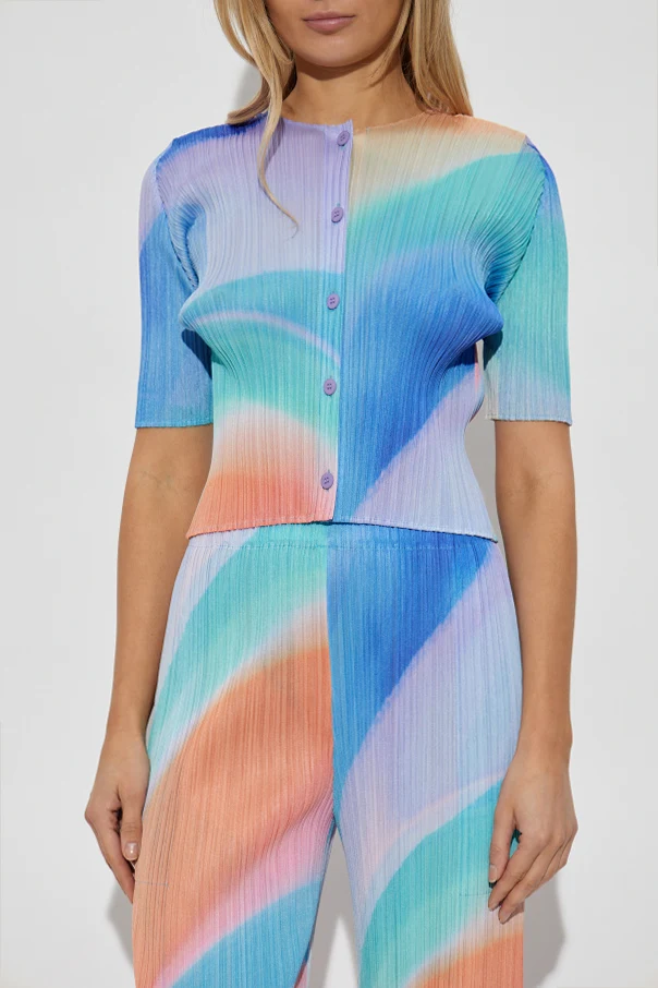Das gesamte Modell ist aus einem besonders hochwertigen Polyester mit einem dezenten Glanz gefertigt; die innovative Plissierungs-Technik verleiht dem Top eine einzigartige Struktur und Elastizität. Das abstrakte, verschwommene Muster in pastelligen Nuancen von Mint, Blau, Rosa und Violett macht jedes Stück zum Unikat und unterstreicht das künstlerische Erbe der Kollektion.