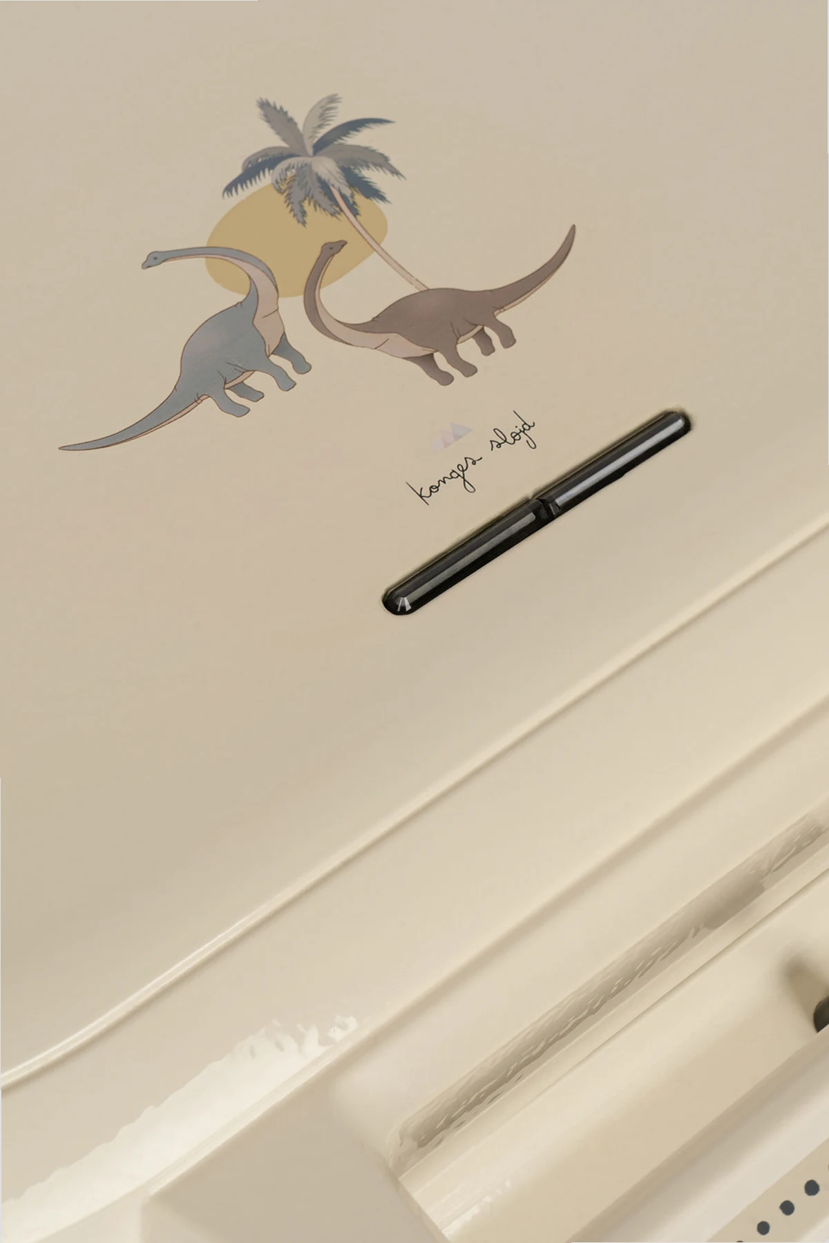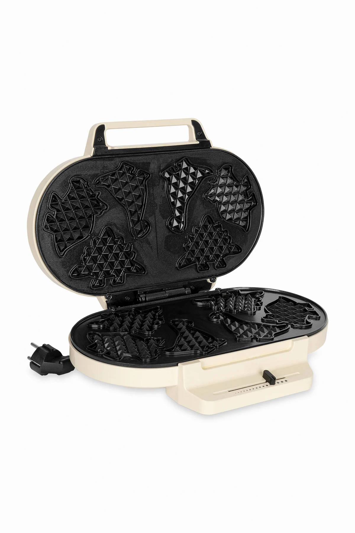 Cream electric double waffle maker from Konges Slojd. Features two different three-slice dinosaur-shaped plates and an easy heating control on the front of the waffle maker. Ceramic coating makes it easy to clean. It is decorated with a logo and a multicolored dino pattern.
