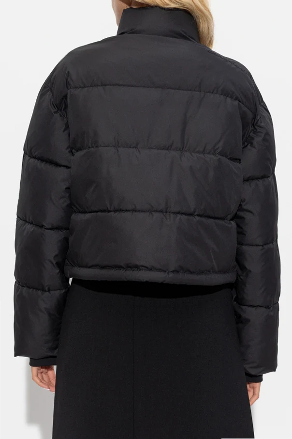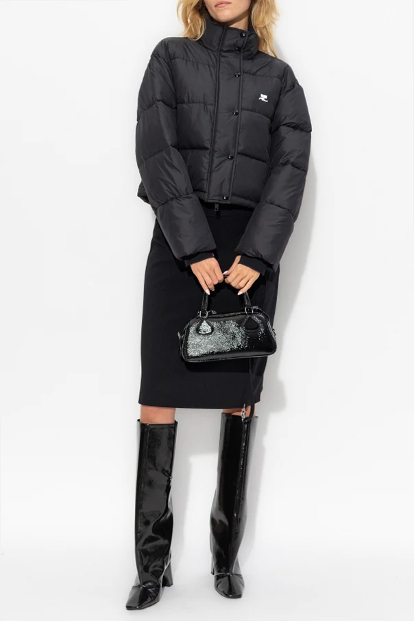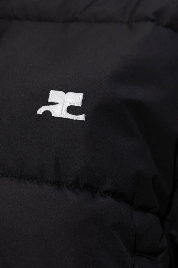 Wattierte Jacke mit Logo ist die Quintessenz des raffinierten Minimalismus, entworfen vom Modehaus Courrèges – einer Marke, die für ihren avantgardistischen Ansatz in Bezug auf Form und moderne Stoffe bekannt ist. Die schwarze Jacke im leicht oversize, kastenförmigen Schnitt besticht durch ihre Schlichtheit und die klaren Linien, die durch dezente, horizontale Steppnähte unterstrichen werden.