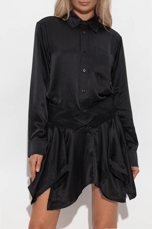 Das Oberteil des Kleides erinnert an ein klassisches Hemd mit Kragen, langen Ärmeln mit Manschetten und einer durchgehenden Knopfleiste auf der Vorderseite. Der unregelmäßige, wellenförmige und markant asymmetrische Saum verleiht dem Kleidungsstück einen einzigartigen Charakter und Bewegungsfreiheit. Ein dezent gesticktes, tonales Designerlogo auf der Brusttasche ergänzt das Gesamtbild.