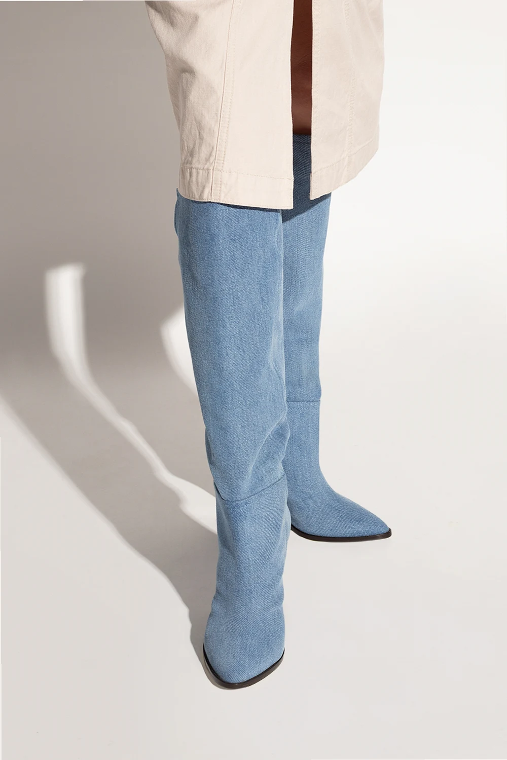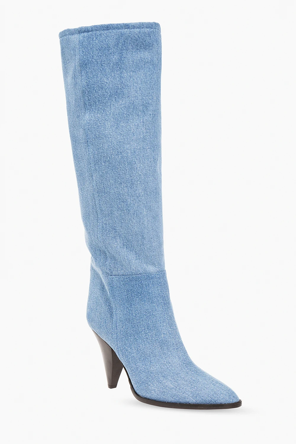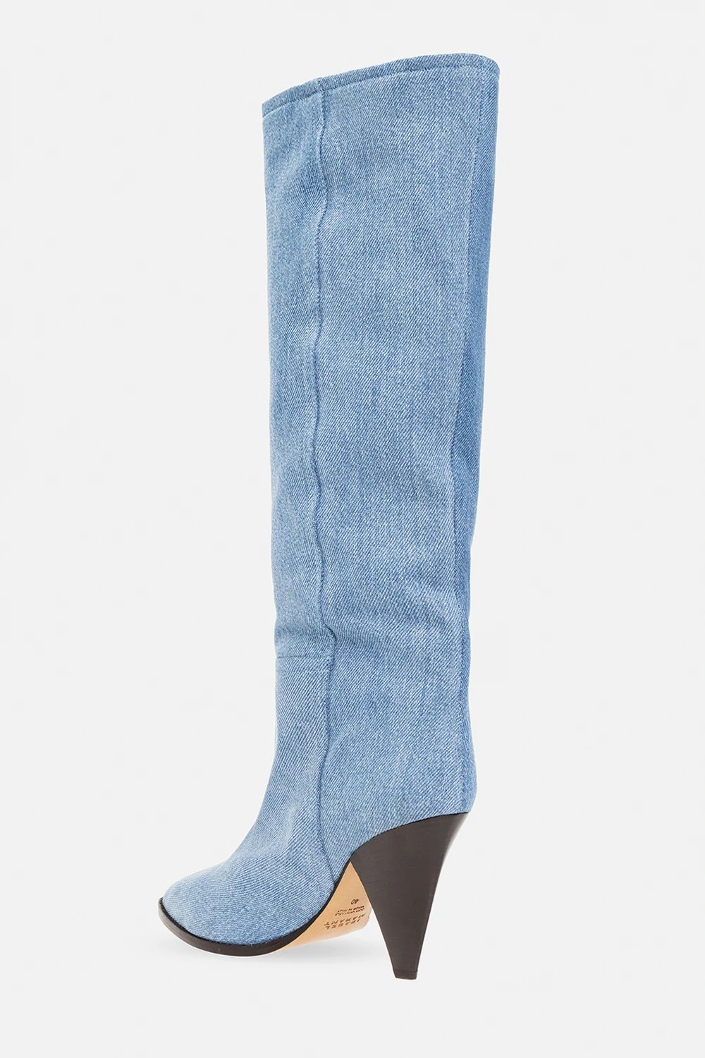 Light blue ‘Ririo’ heeled boots with a brown leather sole from Isabel Marant. Cut from denim.