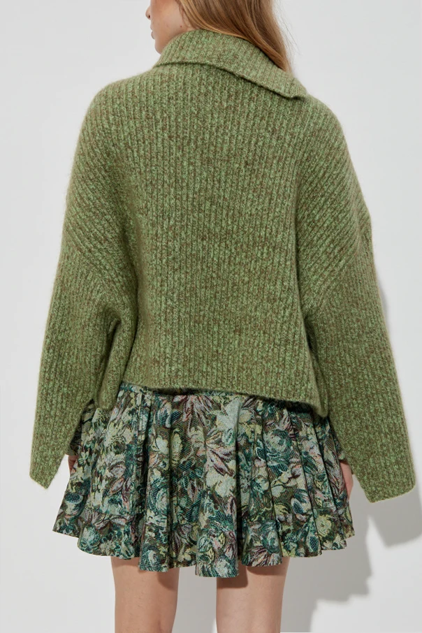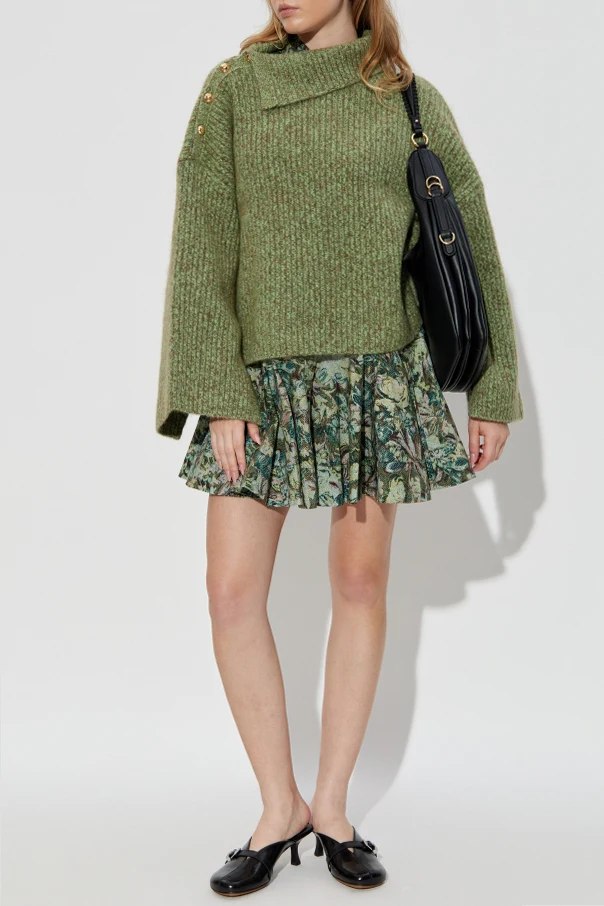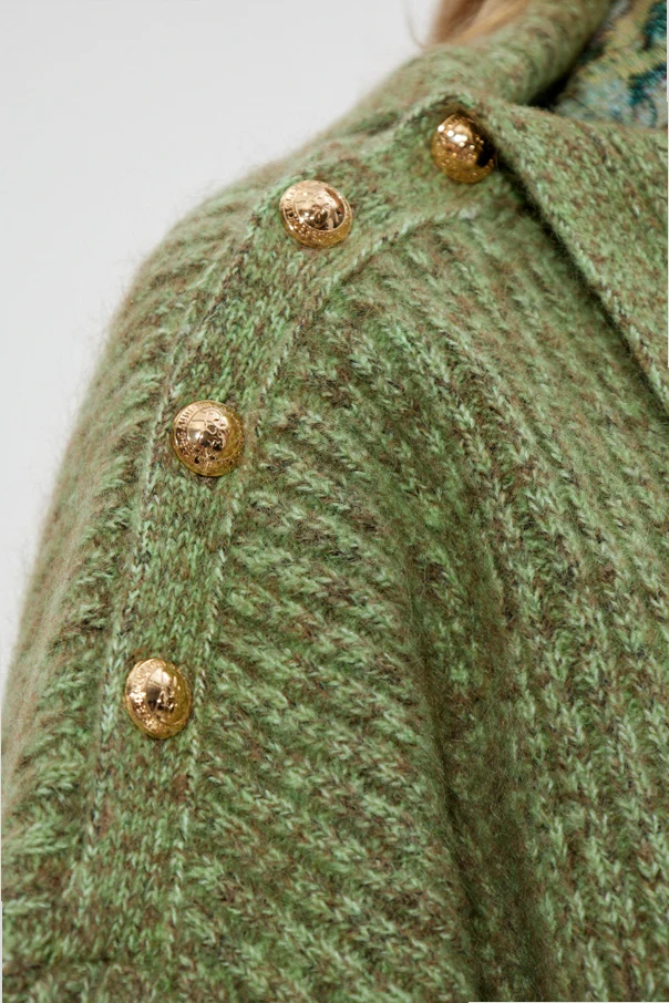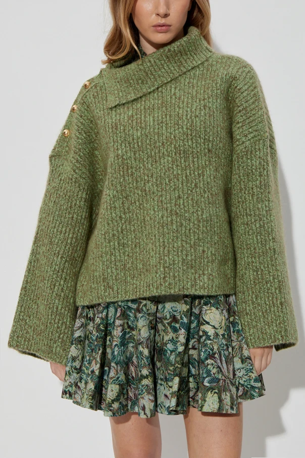 Besonders hervorzuheben sind die vier dekorativen, geprägten goldenen Knöpfe auf der linken Schulter – ein luxuriöses Finish, das wunderbar mit dem edlen Strick aus Wolle und Mohair harmoniert. Durch den minimalistischen Ansatz verzichtet der Pullover auf sichtbare Logos und begeistert mit zeitloser Eleganz.