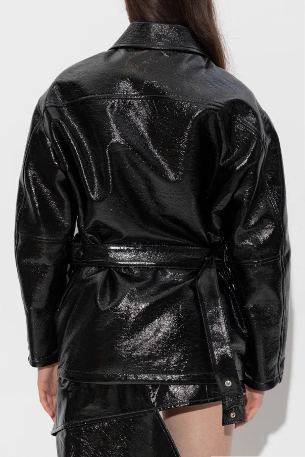 Die lackierte Jacke von Courrèges ist ein Synonym für moderne Eleganz – in einer leicht oversize Silhouette gehalten, begeistert sie mit einer klaren Schnittführung und einem klassischen, hemdartigen Kragen. Dank der glänzenden, lackierten Oberfläche des Materials strahlt sie Raffinesse aus und zieht mit ihrer außergewöhnlichen Textur alle Blicke auf sich. Der zentrale, robuste Reißverschluss in silberner Farbe mit großem Schieber ist ein markantes Detail, das zugleich den futuristischen Charakter des Produkts unterstreicht.