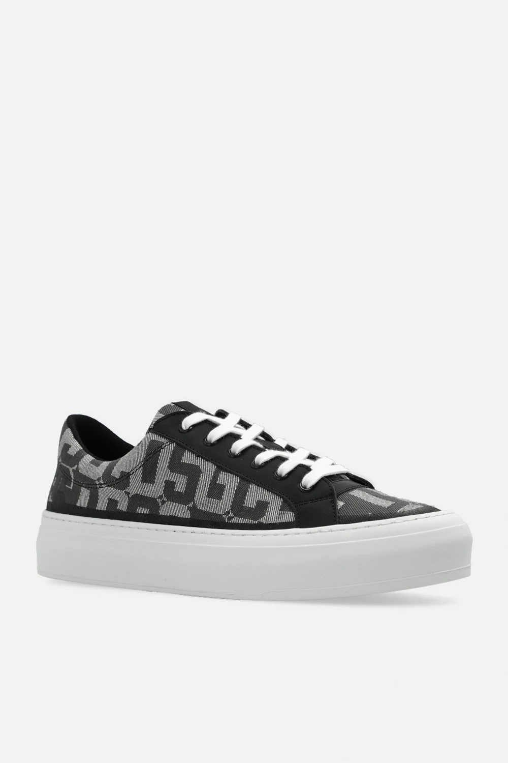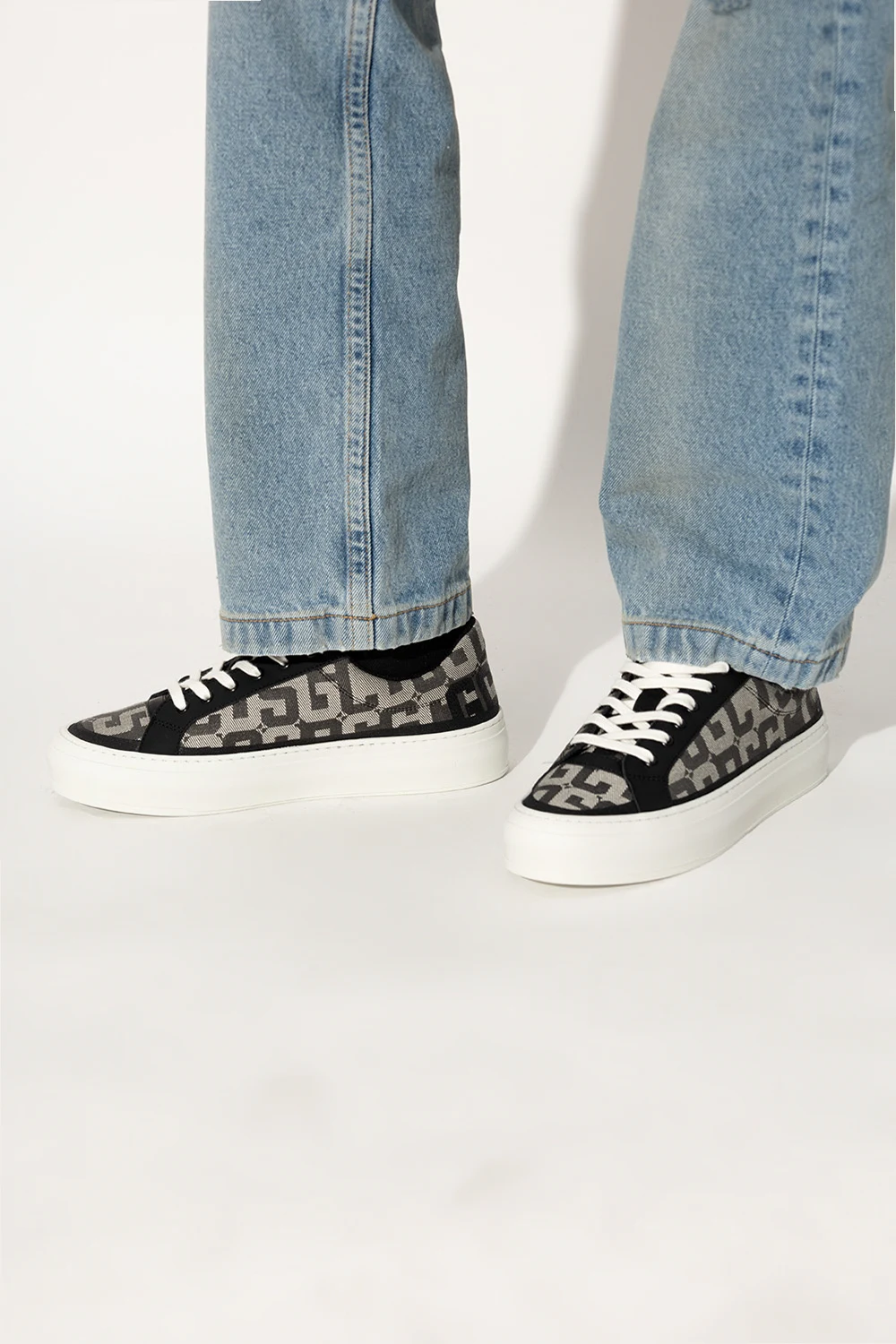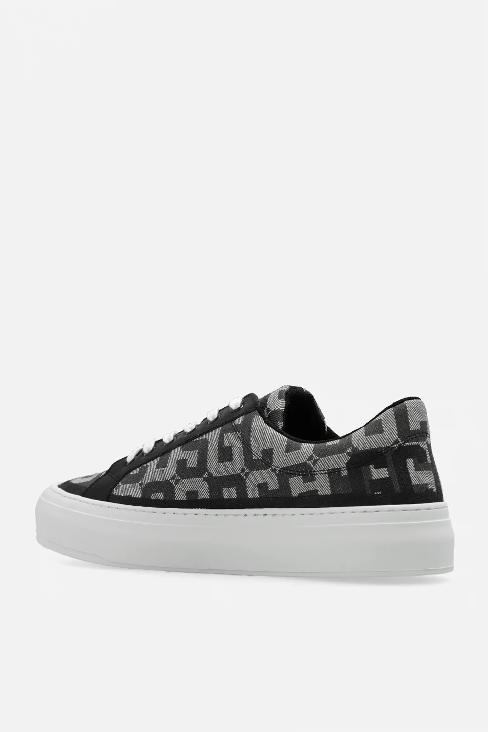 Grey and black sneakers from GCDS. Made of fabric with leather trims, this lace-up pair features a jacquard monogram pattern and white rubber sole.