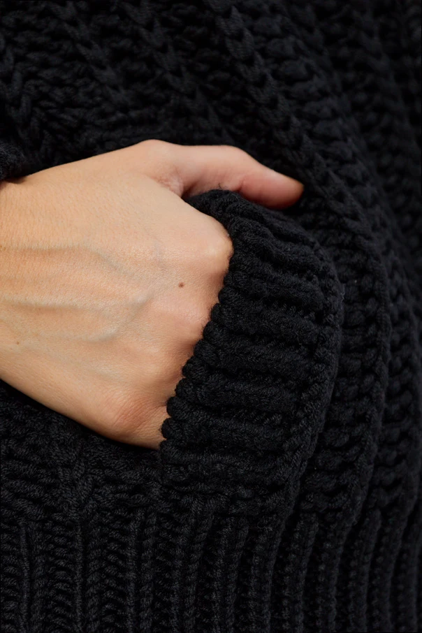 Der klassische, leicht oversized Schnitt mit verlängerten Schultern betont die Bewegungsfreiheit, während die weiten Ärmel und der tiefe V-Ausschnitt eine raffinierte Note hinzufügen. Die schlichte, einfarbig schwarze Farbe macht dieses Modell zu einer vielseitigen Wahl für jeden Anlass.
