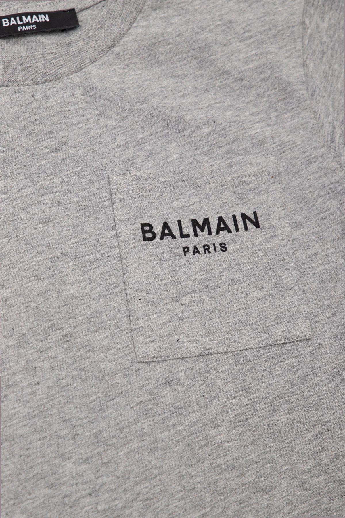 Grey T-shirt from Balmain Kids. Made of cotton, this short sleeve design features a black logo pattern, slip pocket and ribbed crew neck.