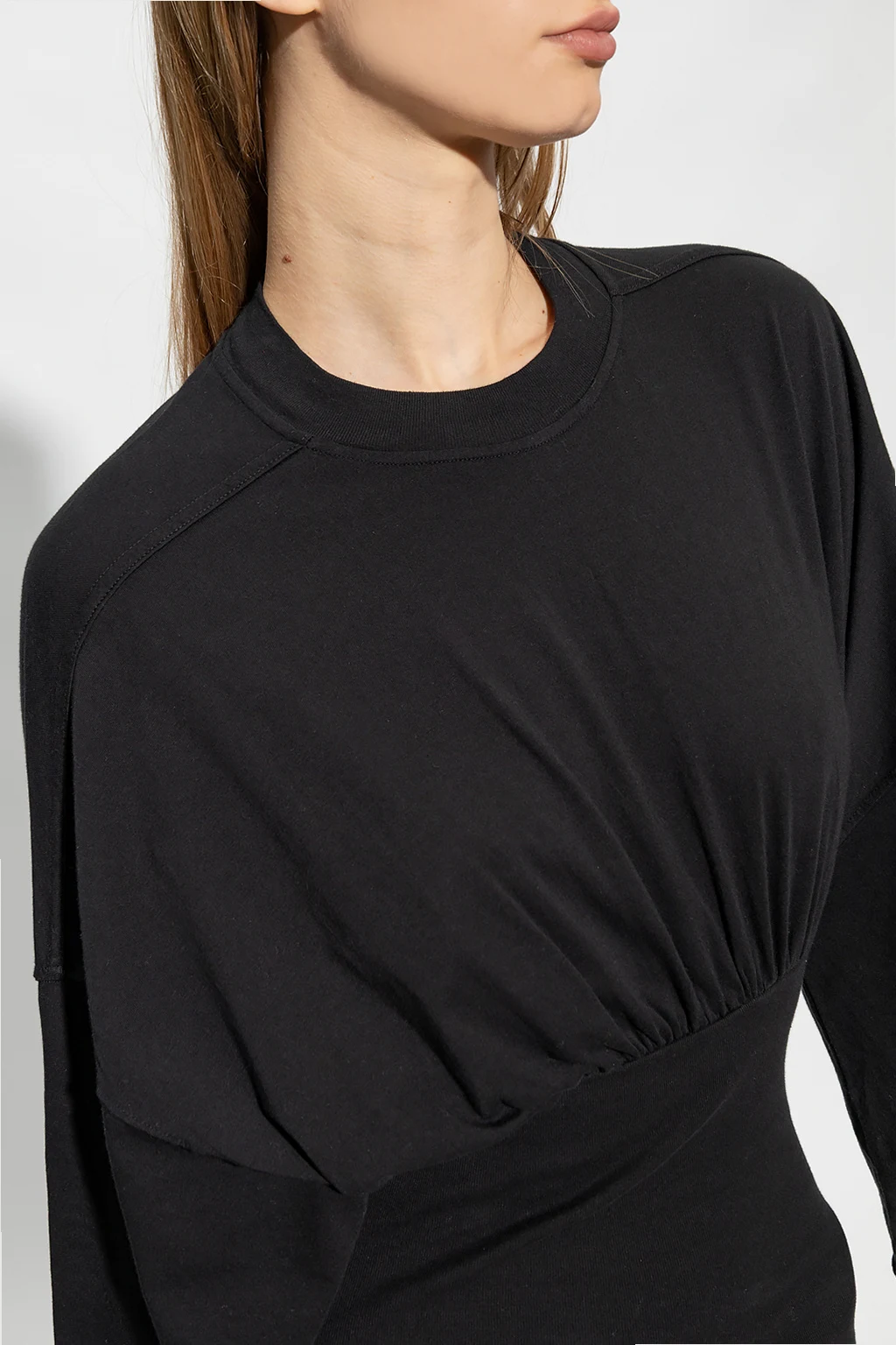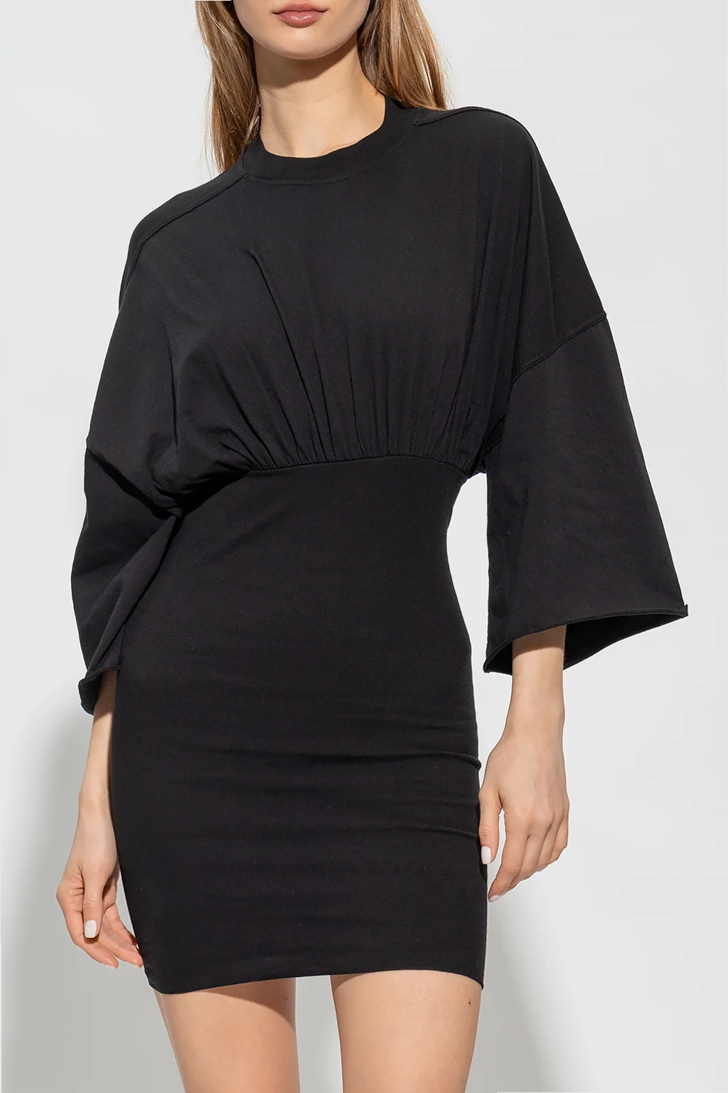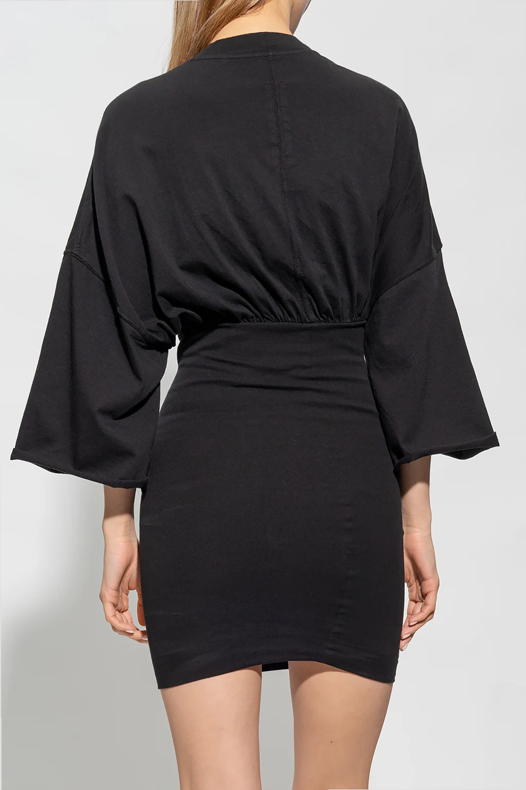 Black ‘Tommy’ mini dress from Rick Owens DRKSHDW. Made of cotton, this loose-fitting design feature shorts sleeves, ribbed round neck and fitted skirt with the brand’s signature strap with a logo.