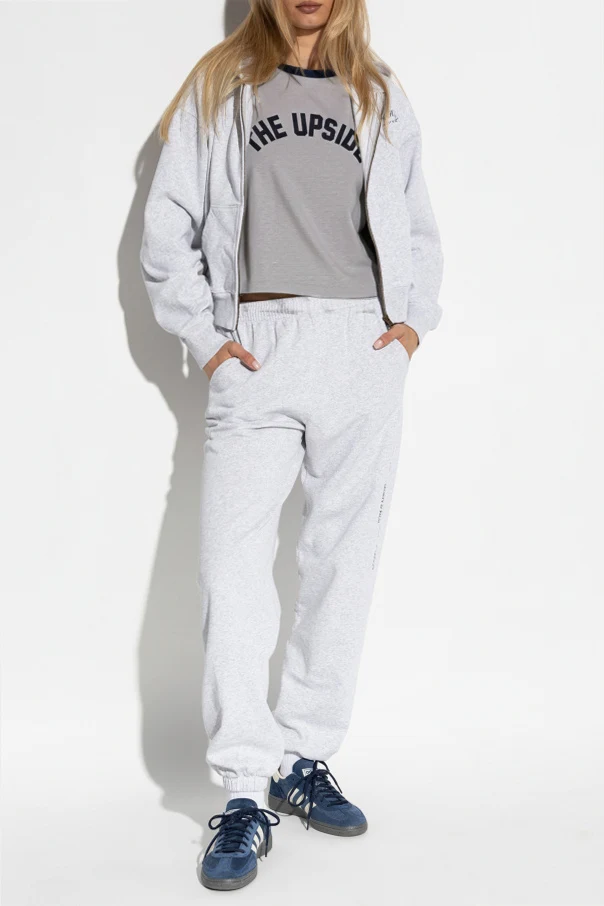 Besonders ins Auge fällt der ausdrucksstarke, abgerundete Schriftzug „THE UPSIDE“ auf der Brust – das charakteristische Markenzeichen des Designers. Der Rundhalsausschnitt und die kurzen Ärmel sind mit kontrastierenden, schwarzen Paspeln eingefasst, was dem Ganzen eine elegante Frische und eine sportliche Note verleiht.