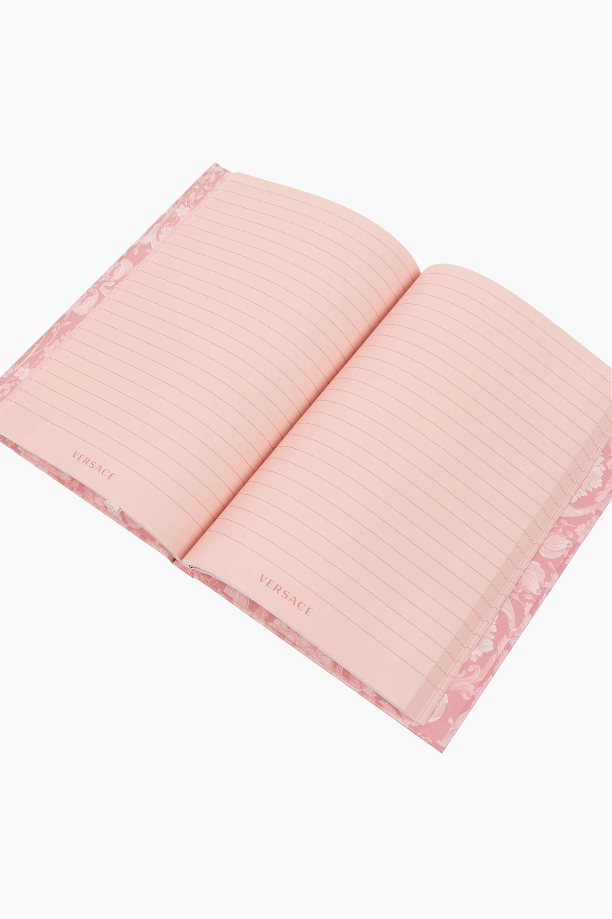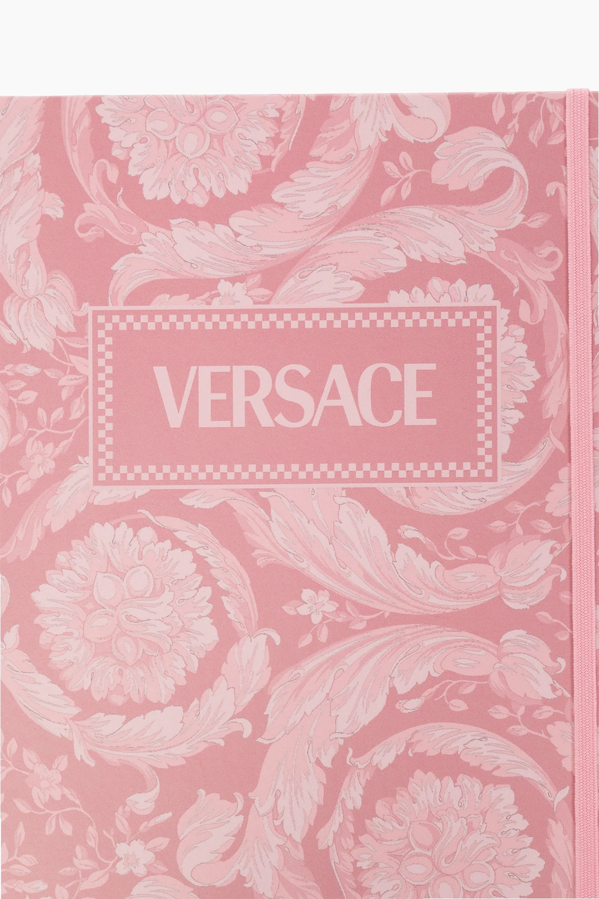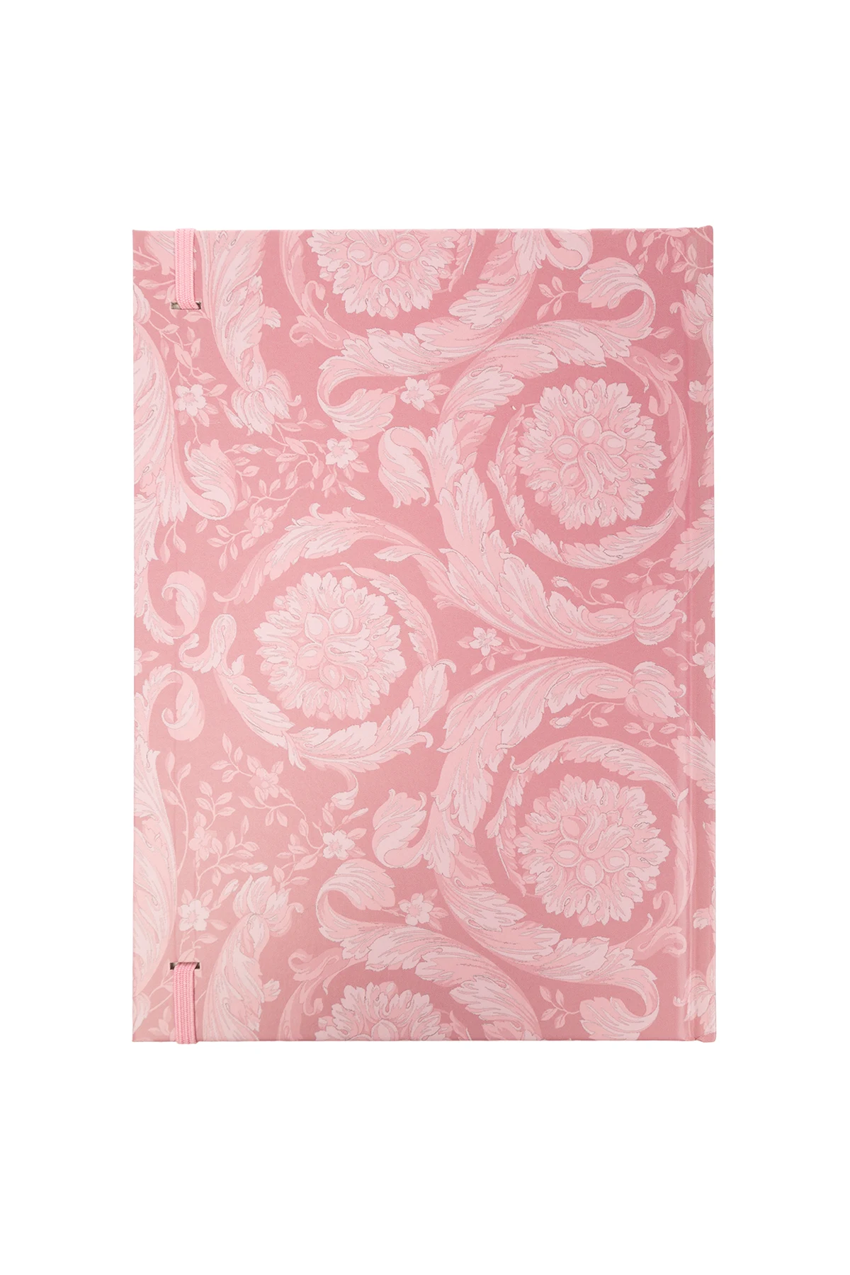 Pink A5 notebook from Versace Home. Made from stone paper in collaboration with Paper on the Rocks with responsibly designed packaging to help protect forests and nature by saving 20 litres of water for each notebook. It features the brand's signature Barocco and monogram print. The standard A5 format has ruled pages with logo accents, a pink ribbon and an elastic band detail.