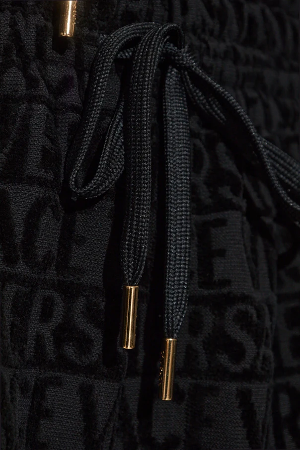 Der elastische Bund, ausgestattet mit einem Kordelzug mit eleganten goldenen Enden, ermöglicht eine perfekte Passform und unterstreicht ihren besonderen Charakter. Auf der gesamten Materialfläche befindet sich ein dezentes, aber ausdrucksstarkes, geprägtes Muster mit dem sich wiederholenden Schriftzug "VERSACE", das Prestige und zeitlosen Stil ausstrahlt.