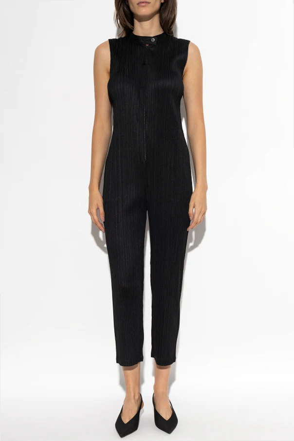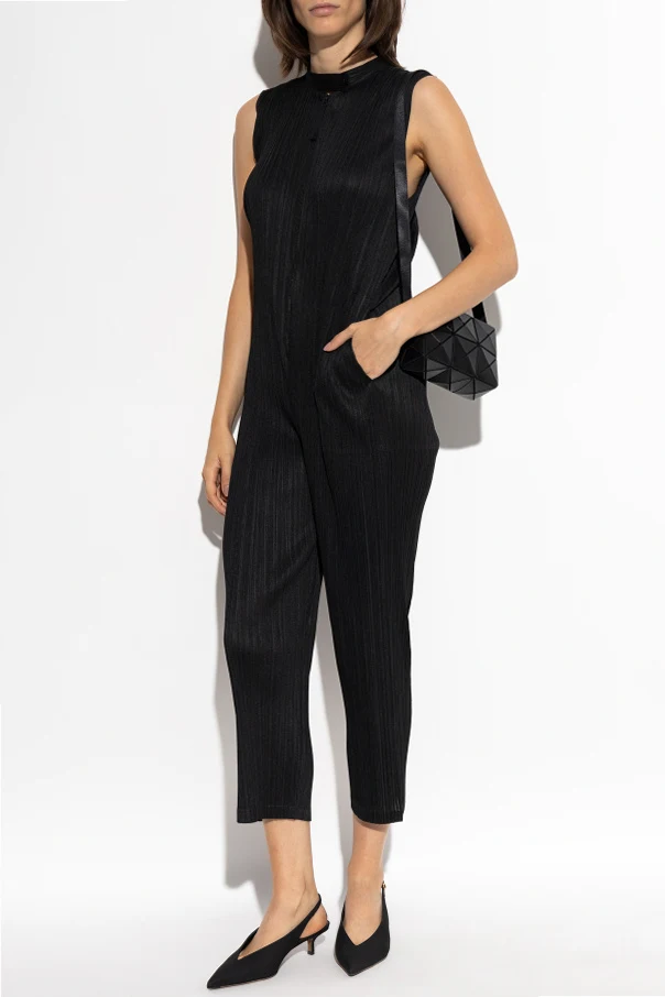 Ärmelloser plissierter Jumpsuit der Marke Pleats Please Issey Miyake verkörpert die Quintessenz japanischer Ästhetik und vereint Minimalismus mit avantgardistischer Eleganz. Gefertigt aus feinem Polyester, schmiegt er sich der Silhouette an und erzeugt dank der sorgfältigen Plissierung auf der gesamten Oberfläche einen dynamischen, skulpturalen Effekt. Der Schnitt akzentuiert die Figur perfekt – abgestufte 7/8-Hosenbeine und breite Träger verleihen dem Gesamtbild eine moderne Note, während der leicht stehende Kragen mit dekorativem Knopf am Hals eine subtile Raffinesse hinzufügt. Der schwarze, matte Stoff mit dezentem Glanz fasziniert und begeistert, und wird zum Synonym für Luxus im Alltag.