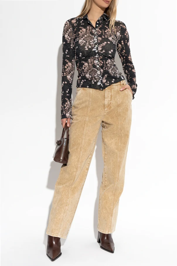 Sorgfältig ausgearbeitete Details wie der kunstvoll geschnittene Kragen und die kontrastierenden Knöpfe unterstreichen den einzigartigen Stil des Tops, das Modernität auf harmonische Weise mit klassischen Linien verbindet.