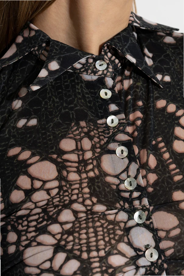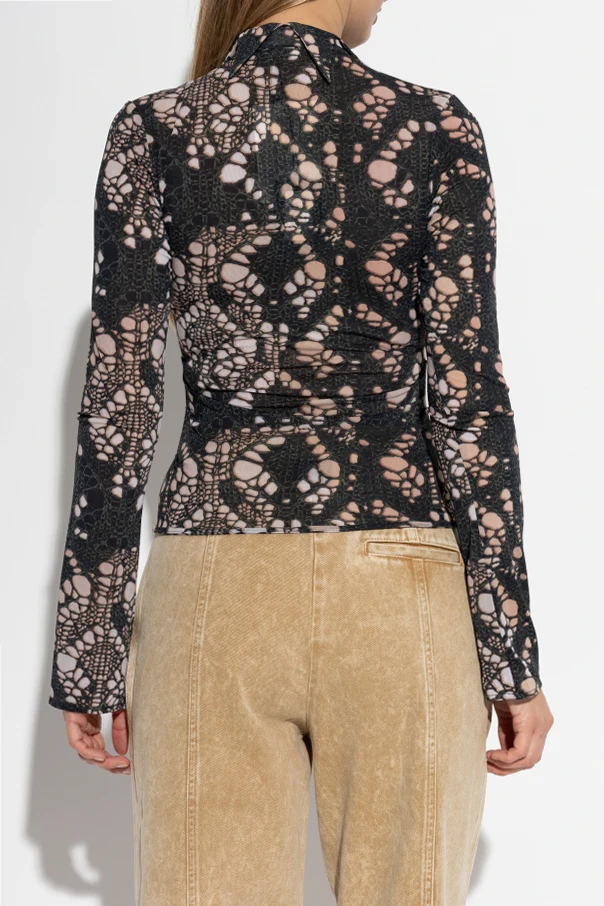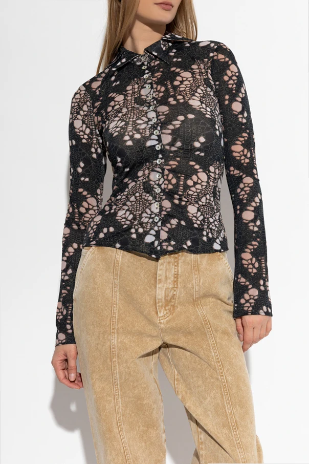 Der einzigartige Charakter dieses Modells wird durch das ausdrucksstarke Muster hervorgehoben, das an ein spitzenartiges, abstraktes Netz in Schwarz erinnert und auf unregelmäßige Weise einen hellrosé-beigen Hintergrund freilegt. Das Material strahlt edle Feinheit aus – der transparente, elastische Stoff bewegt sich sanft mit und verleiht ein Gefühl von raffinierter Leichtigkeit und Exklusivität.