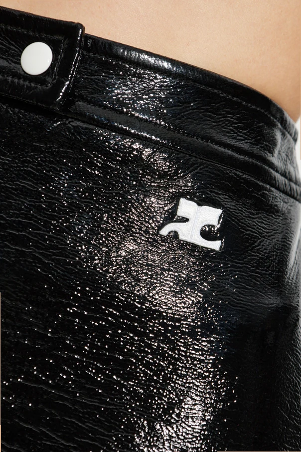 Der kurze Rock , signiert vom Modehaus Courrèges , ist ein Meisterwerk der zeitgenössischen Damenmode, das Eleganz harmonisch mit modernem Ausdruck verbindet. Verführerisch schwarz und mit spektakulärem Glanz wurde er in Trapezform bis zur Mitte des Oberschenkels geschnitten, mit dezent betontem, mittelhohem Bund.